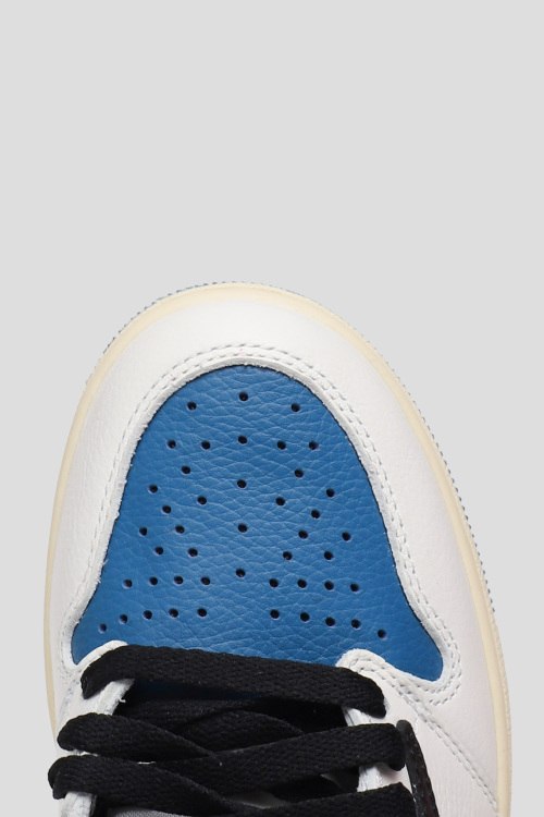 Женские бело-синие хайтопы из натуральной кожи от Nike (Найк). Закруглённый носок, перфорированные вставки, комбинированный дизайн, фирменный логотип бренда, классическая шнуровка спереди, в комплекте разноцветная шнуровка.