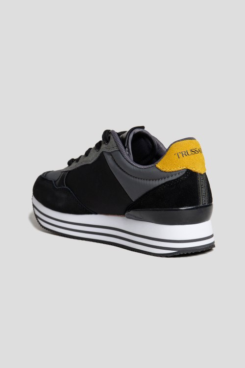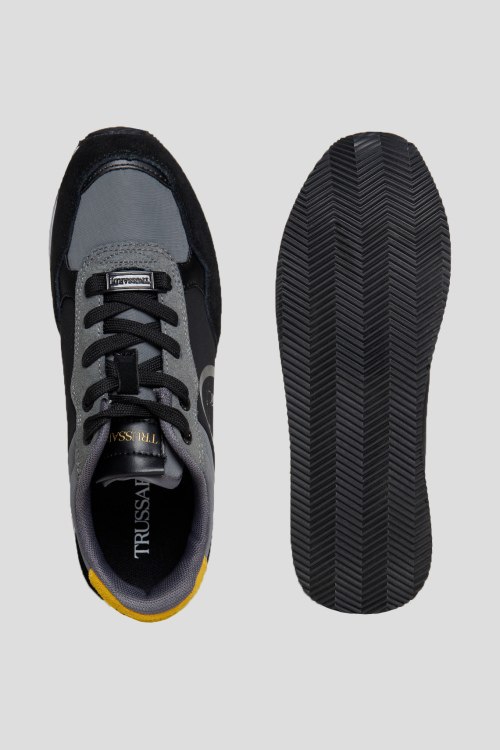 Детали: Женские черно-серые кроссовки из натуральной замши и текстиля от Trussardi (Труссарди). Закругленный носок, спереди классическая шнуровка, комбинация цветов и материалов, высокая подошва контрастного цвета, логотип бренда