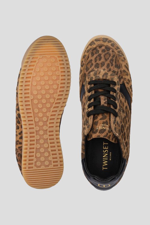 Детали: Женские леопардовые замшевые кроссовки от TWINSET (Твинсет). Анималистичный принт по всей поверхности, логотип сбоку и на язычке, классическая шнуровка, закругленный носок, бежевая подошва