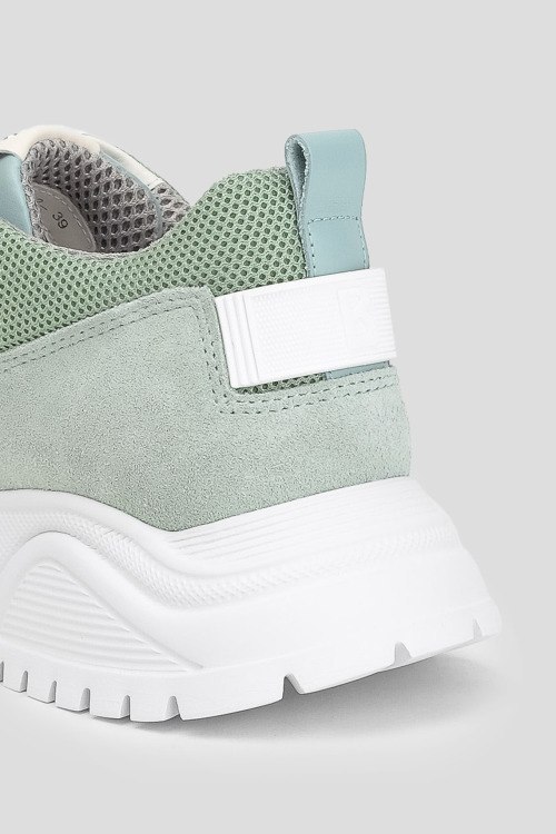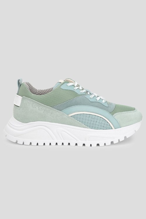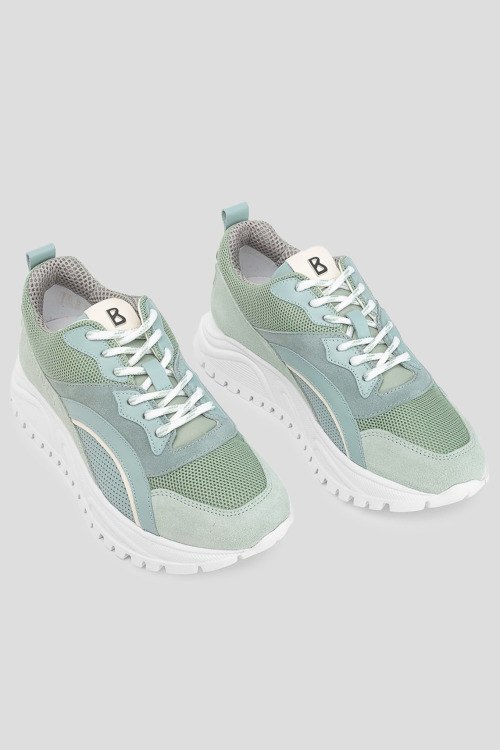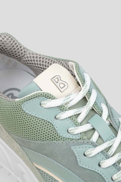 Детали: Женские мятные кроссовки из замши и текстиля Malaga от Bogner (Богнер). Комбинация цветов и материалов, логотип сбоку и на язычке, классическая шнуровка, закругленный носок, белая подошва