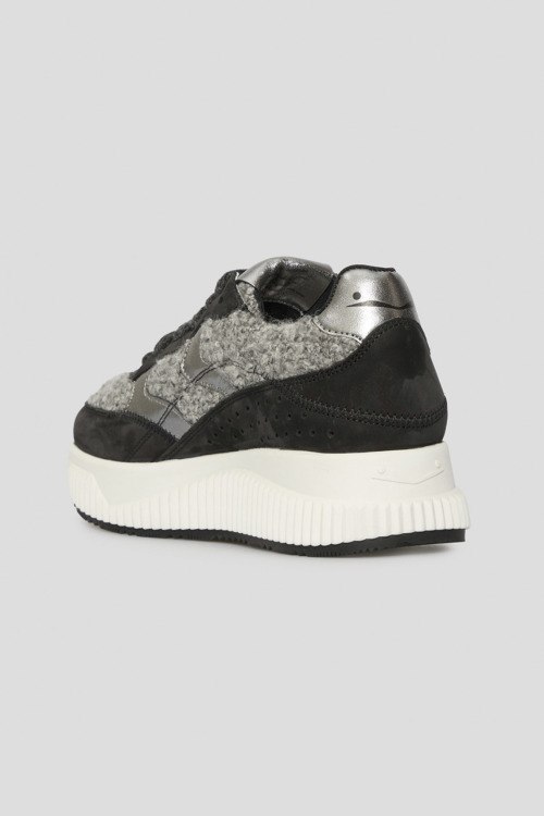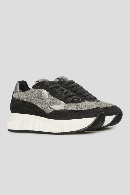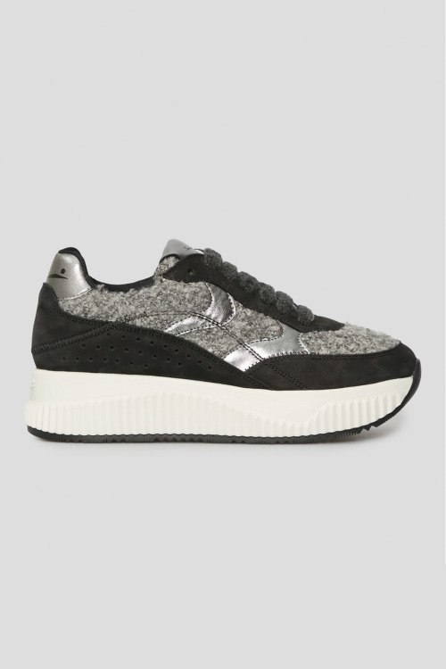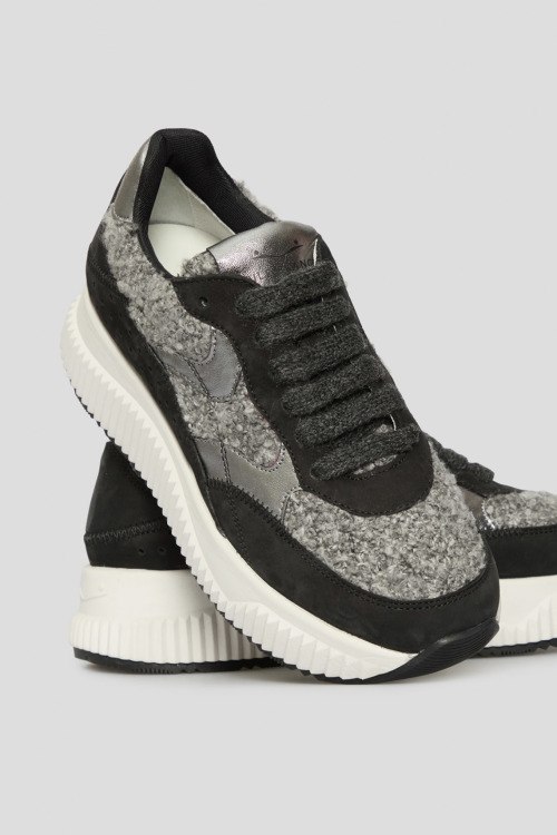 Детали: Женские серо-черные кроссовки из нубука и шерсти от Voile Blanche (Вуаль Бланш). Комбинация цветов и материалов, логотип на язычке, классическая шнуровка, закругленный носок, резиновая подошва. Высота подошвы: 4 см