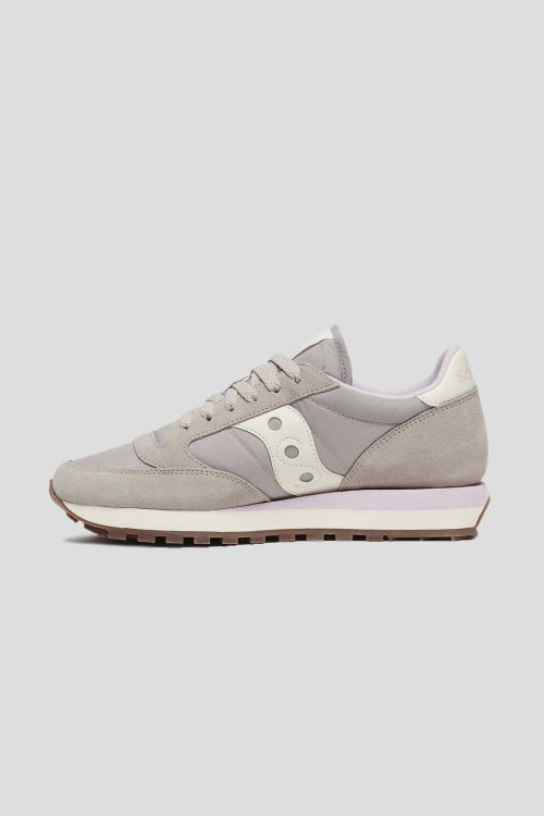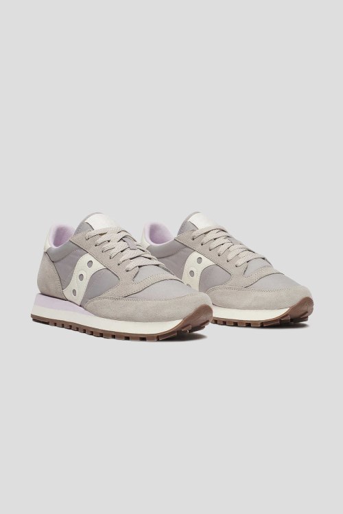 Детали: Женские серые кроссовки из замши и текстиля Jazz Original от Saucony (Сайкони). Комбинация материалов, логотип сбоку и на язычке, классическая шнуровка, закругленный носок, резиновая подошва