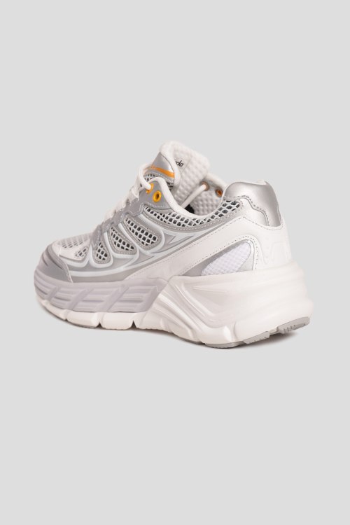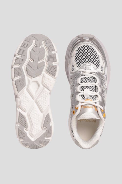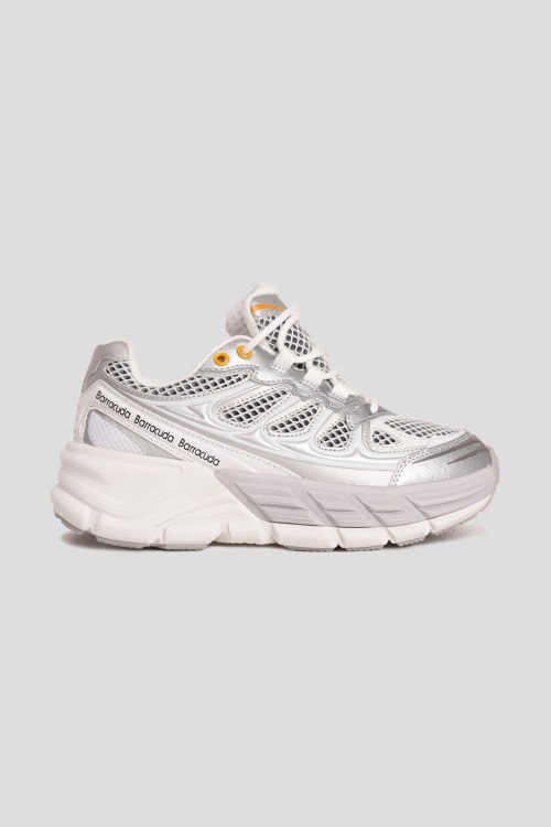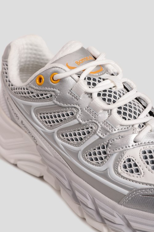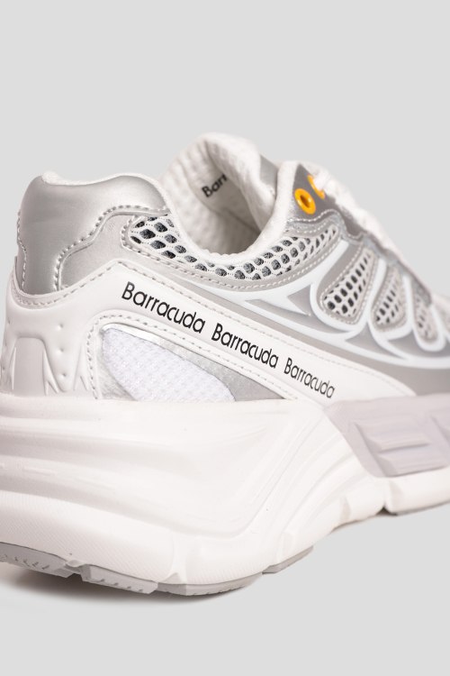 Детали: Женские бело-серебристые кроссовки из натуральной кожи и текстиля от Barracuda (Барракуда). Дизайн в виде комбинации цветов и материалов, закругленный носок, спереди классическая шнуровка, логотип бренда, массивная подошва