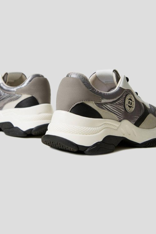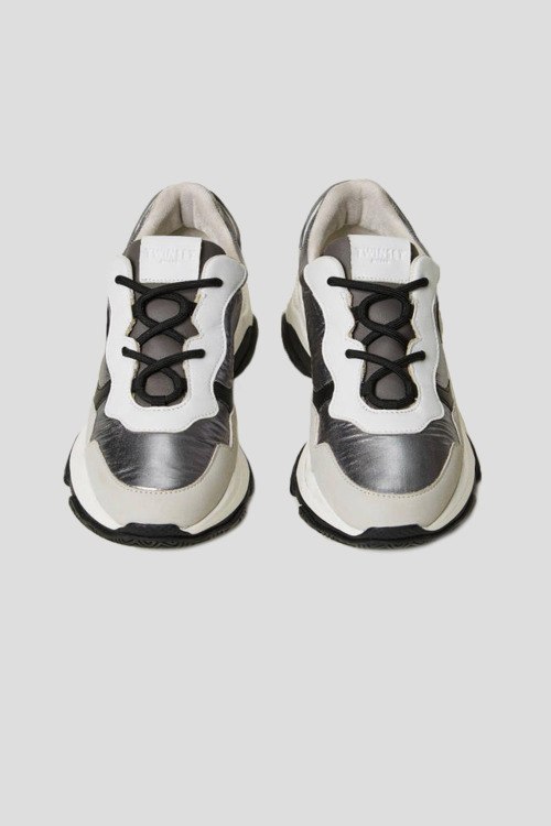 Детали: Женские серебристые кроссовки из текстиля и экокожи от TWINSET (Твинсет). Комбинированный дизайн, спереди шнуровка, массивная подошва, патч-лого