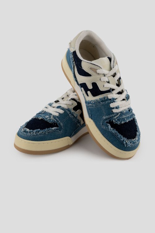 Детали: Женские синие джинсовые кроссовки Match от Fendi (Фенди). Комбинация цветов, нашивка с логотипом сбоку и на язычке, классическая шнуровка, закругленный носок, брендированная подошва