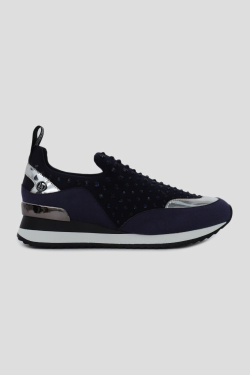 Детали: Женские синие текстильные кроссовки от Liu Jo (Лиу Джо). Модель на низком ходу, ровная подошва, без застежки, задник с петлей, комбинация цветов, серебристые и металлические вставки, спереди декор из камней