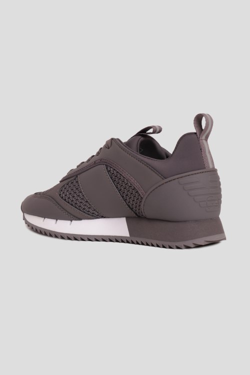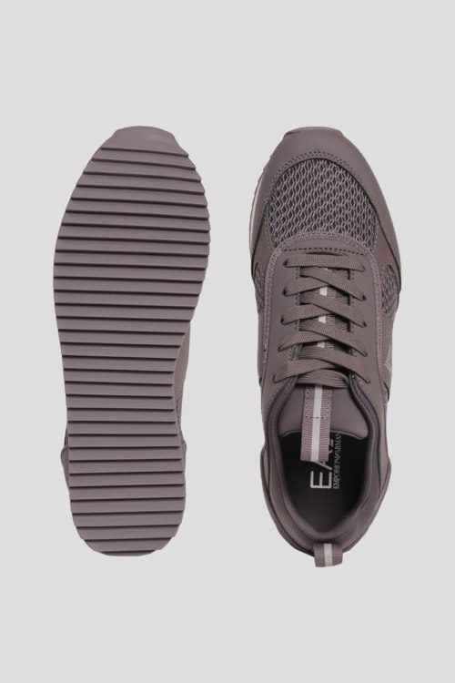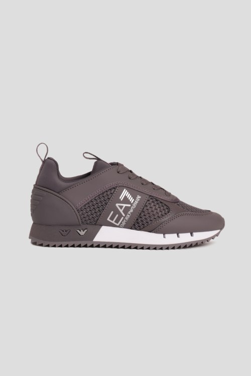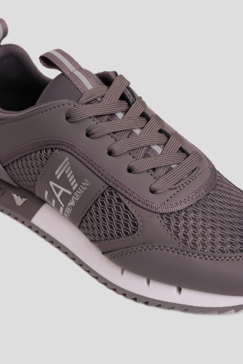 Детали: Женские темно-серые кроссовки из экокожи и текстиля от EA7 Emporio Armani (ЕА7 Эмпорио Армани). Комбинация материалов, логотип сбоку, две петли для подтягивания, классическая шнуровка, закругленный носок, резиновая подошва