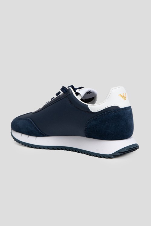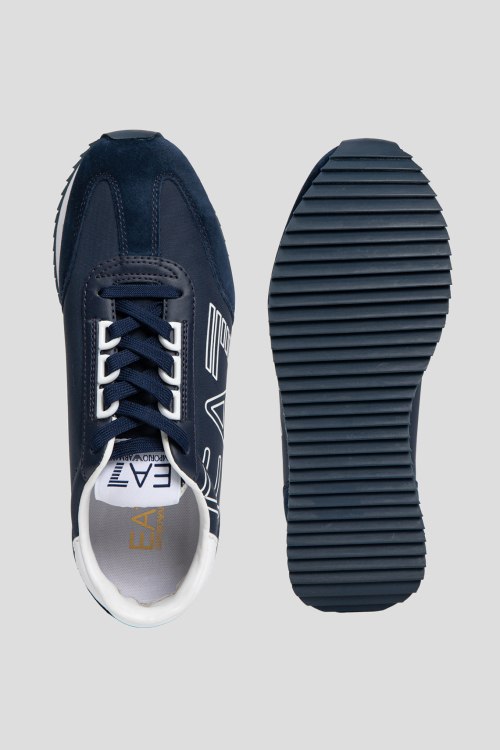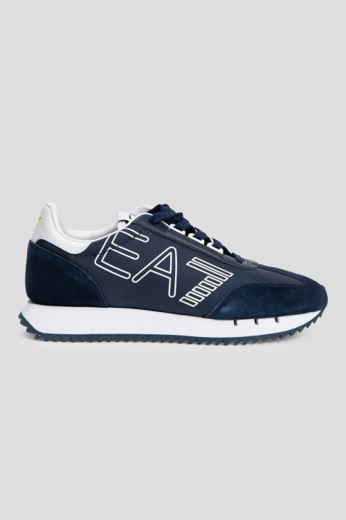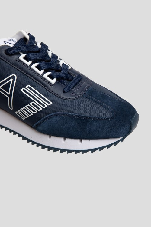 Детали: Женские темно-синие кроссовки из замши и текстиля от EA7 Emporio Armani (ЕА7 Эмпорио Армани). Комбинация материалов, логотип сбоку и на язычке, классическая шнуровка, закругленный носок, белая подошва