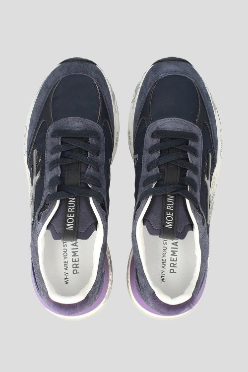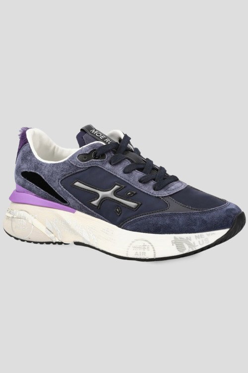 Детали: Женские темно-синие кроссовки из замши и текстиля от Premiata (Премиата). Комбинированный дизайн, закругленный носок, спереди шнуровка, патч-лого, резиновая подошва, меховая вставка на заднике