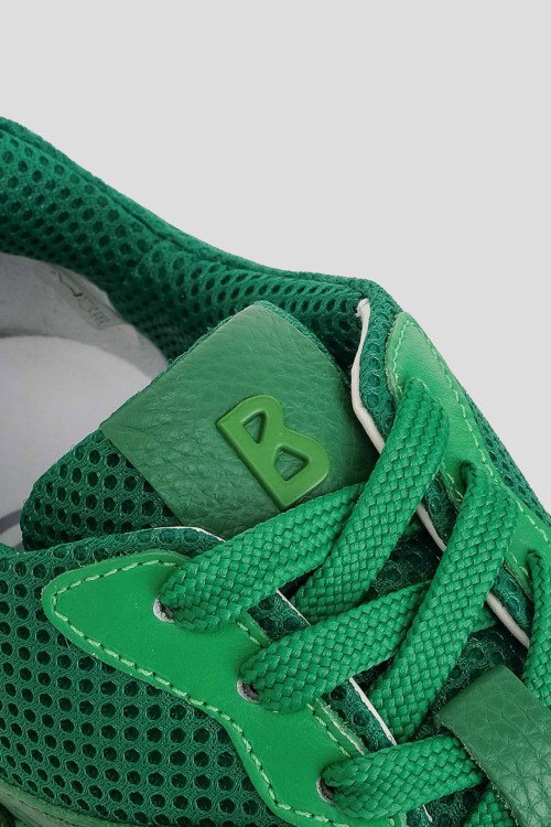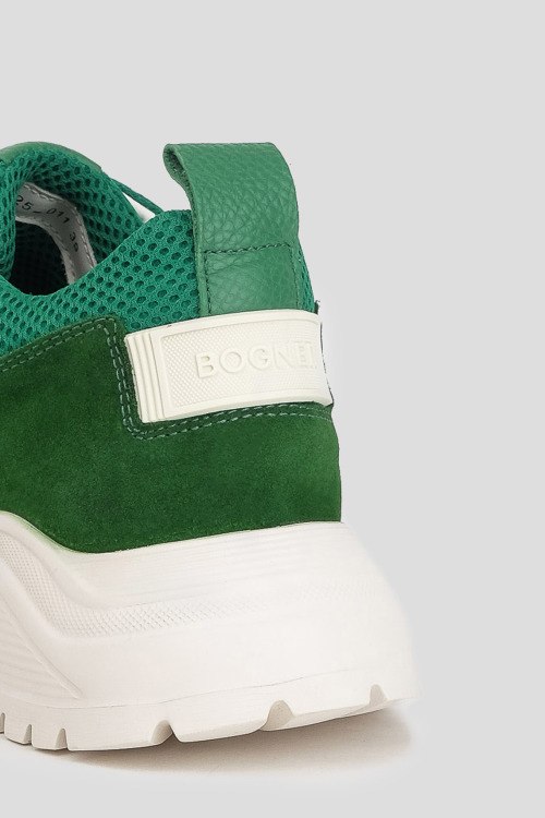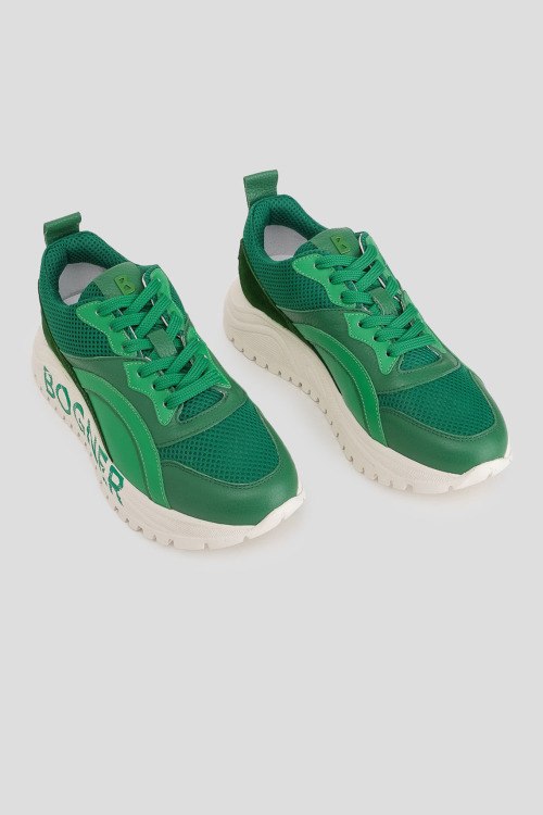 Женские зеленые кроссовки из кожи и текстиля Malaga от Bogner (Богнер). Комбинация материалов, логотип на язычке и на пятке, петля для подтягивания сзади, классическая шнуровка, закругленный носок, брендированная подошва