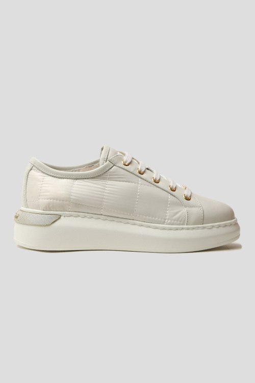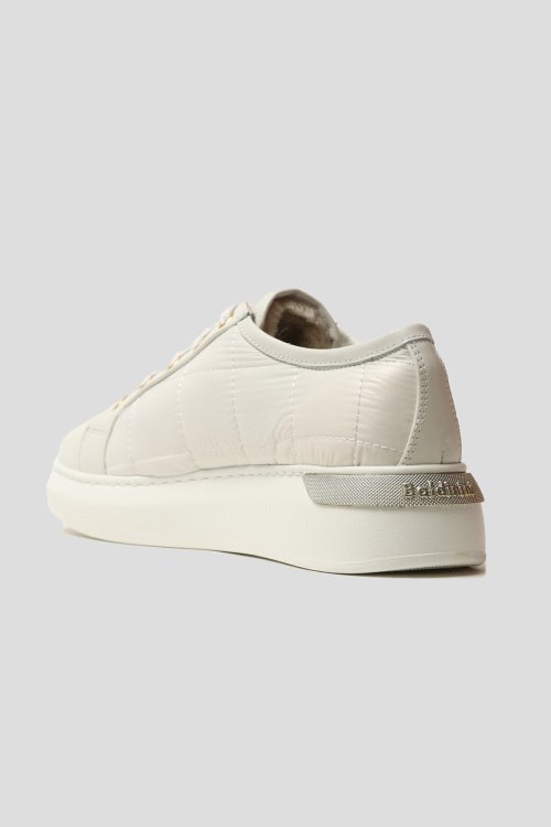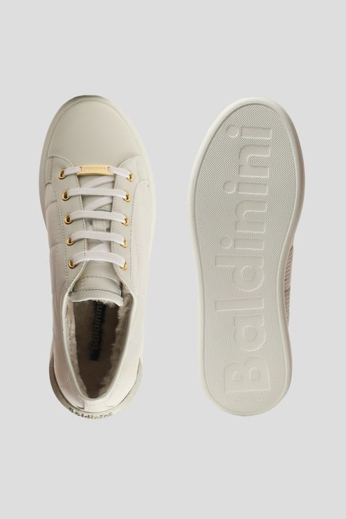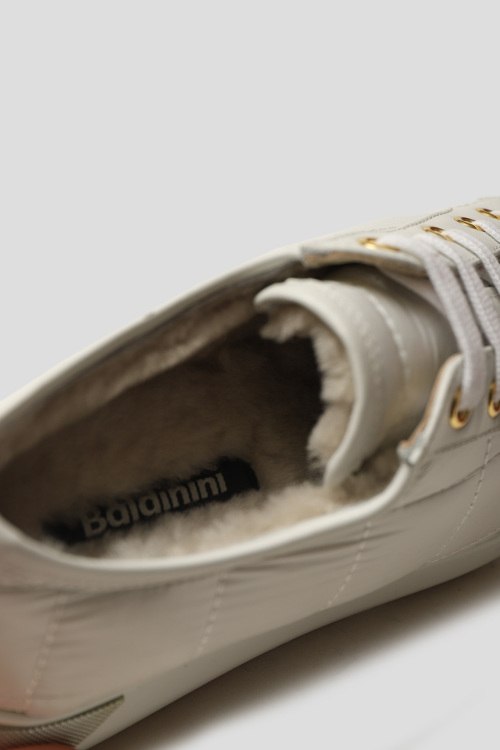 Детали: Женские белые кожаные кроссовки на меху от Baldinini (Балдинини). Спереди классическая шнуровка, закругленный носок, по бокам стеганый дизайн, плоская подошва, декорированы тиснением с логотипом бренда, утепленные натуральным мехом