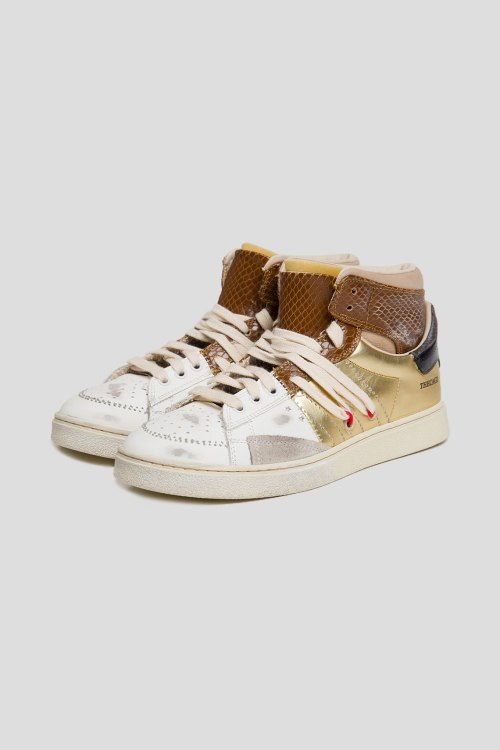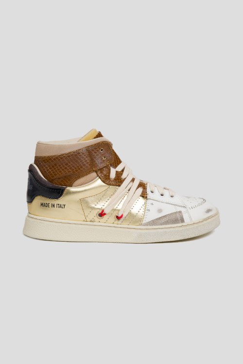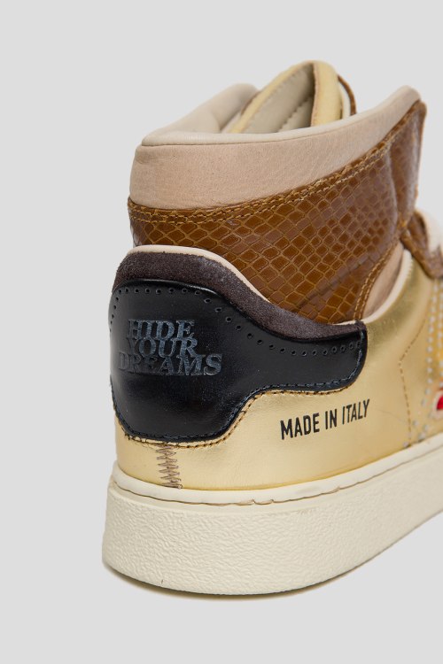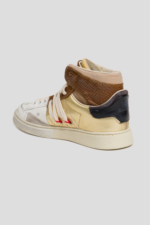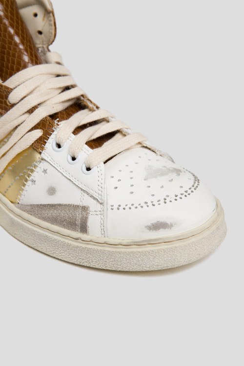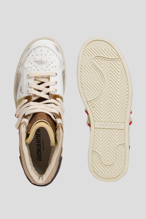 Детали: Женские хайтопы из натуральной кожи от Hidnander (Хиднандер). Комбинированный дизайн, закругленный носок, спереди классическая шнуровка, брендированная вставка на заднике, модель утепленная мехом, резиновая подошва бежевого цвета, винтажный дизайн с потертостями
