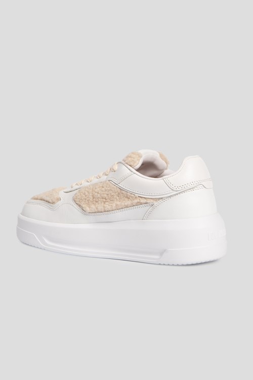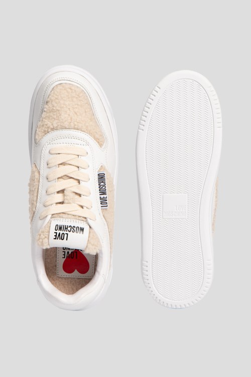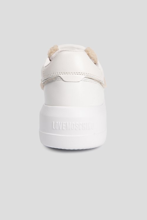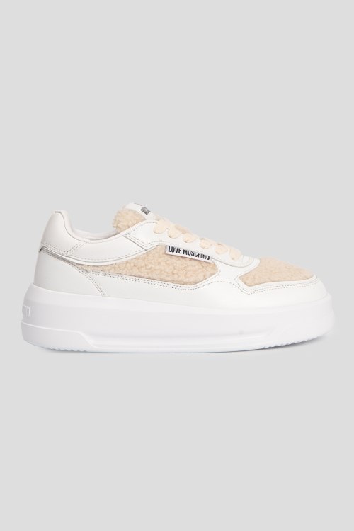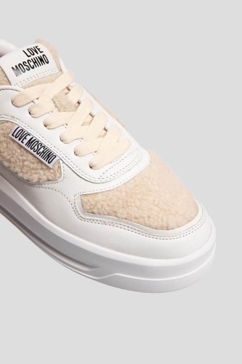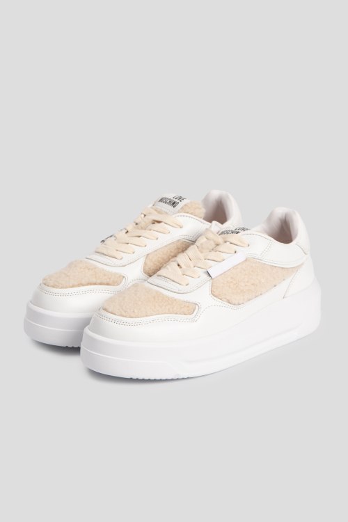 Детали: Женские белые кроссовки из кожи и текстиля от Love Moschino (Лав Москино). Комбинация цветво и материалов, закругленный носок, спереди классическая шнуровка, толстая подошва, модель утепленная мехом