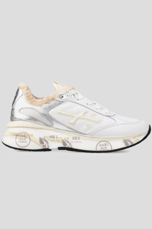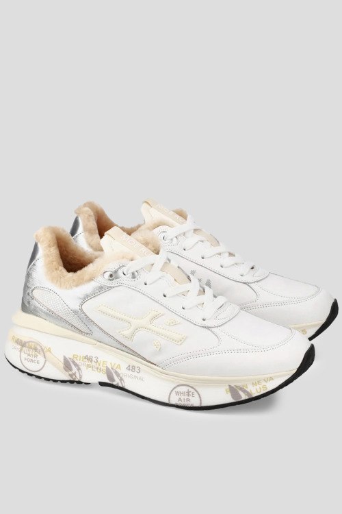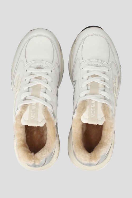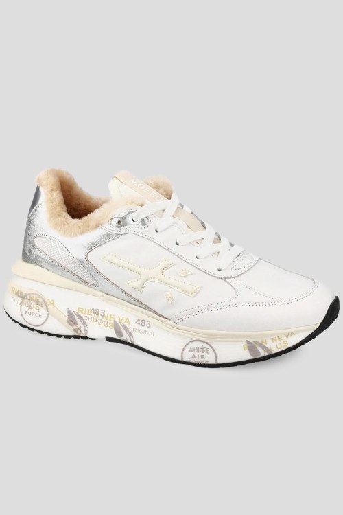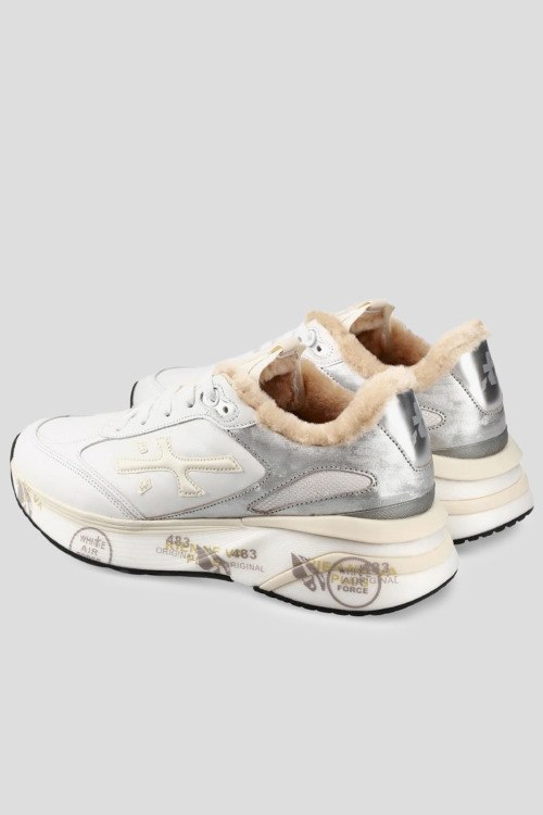 Детали: Женские белые кроссовки из экокожи от Premiata (Премиата). Комбинированный дизайн, закругленный носок, спереди шнуровка, патч-лого, резиновая подошва, модель утепленная мехом