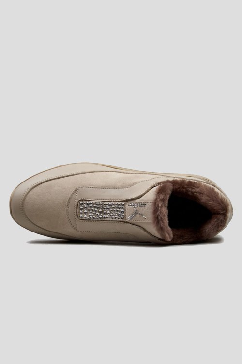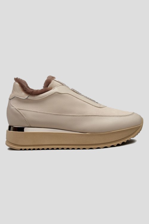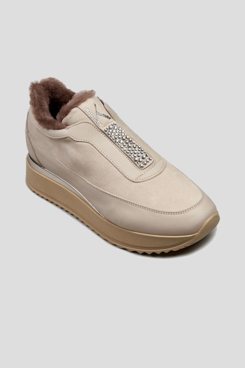 Детали: Женские бежевые кроссовки из кожи и замши на меху от Kelton (Кельтон). Комбинация материалов, декор стразами, закругленный носок, внутри на меху. Высота подошвы: 4 см