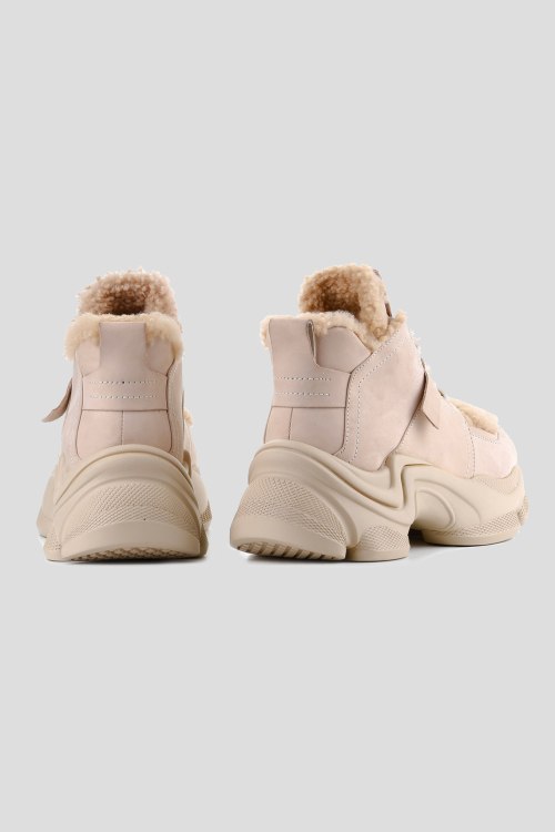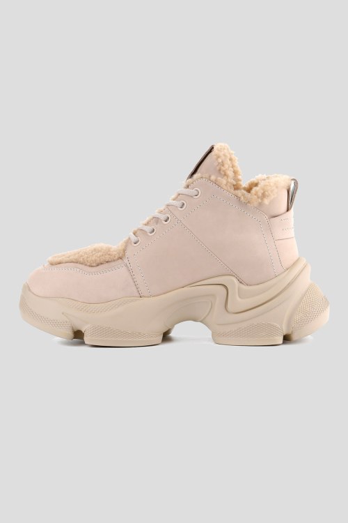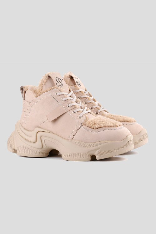 Детали: Женские бежевые кроссовки из нубука от Le Berdes (Ле Бердес). Закругленный носок, спереди классическая шнуровка, массивная подошва, комбинированный дизайн, меховые вставки, петля для подтягивания, модель утепленная мехом