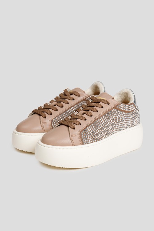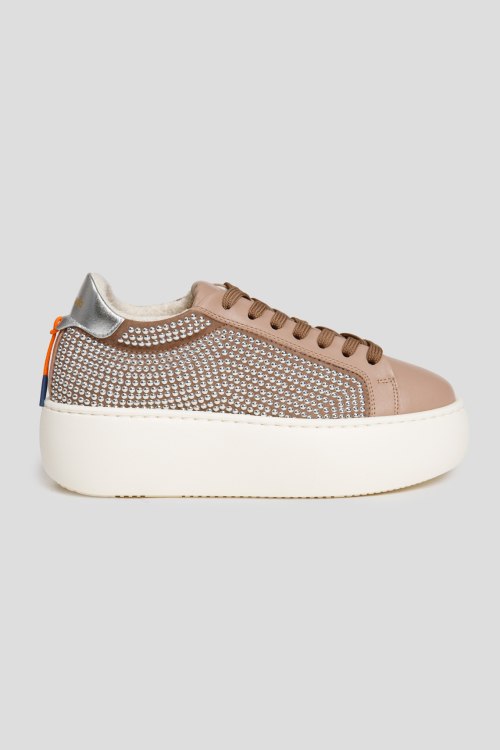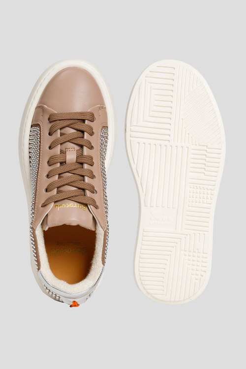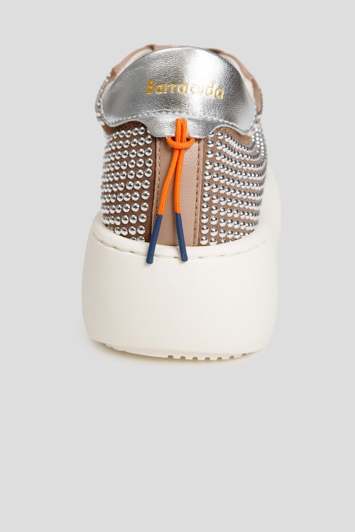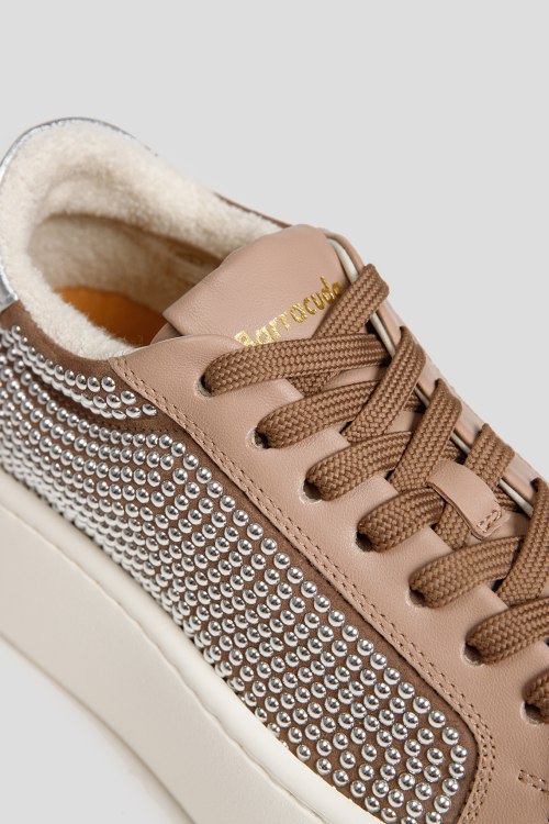 Женские бежевые кеды из натуральной кожи и текстиля от Barracuda (Барракуда). Закругленный носок, спереди классическая шнуровка, модель декорирована кристаллами, логотип бренда на язычке, модель утепленная текстильным материалом, высокая подошва белого цвета. Измерения: подошва - 5 см