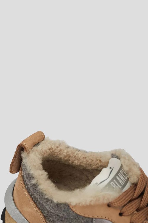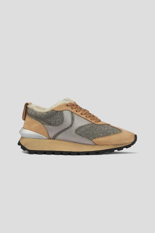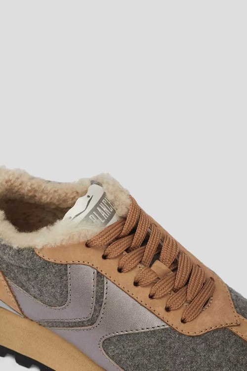 Детали: Женские бежево-серые кроссовки на меху из замши и войлока от Voile Blanche (Вуаль Бланш). Комбинация цветов и материалов, логотип на язычке, классическая шнуровка, зауженный носок, внутри на меху