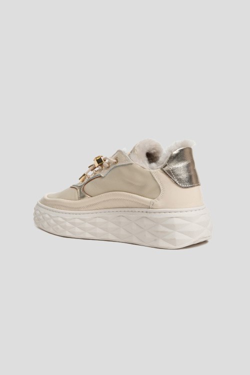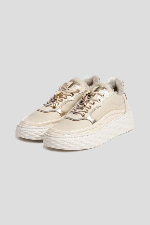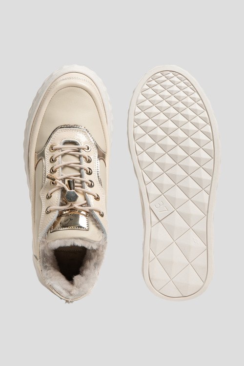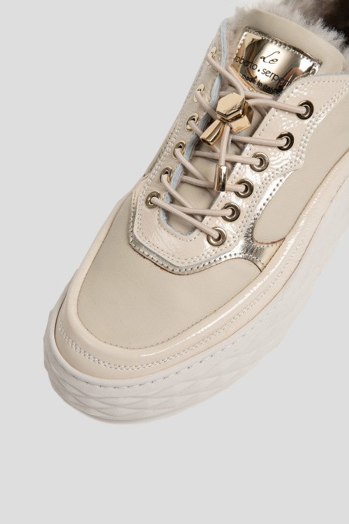 Детали: Женские бежевые кожаные кроссовки на меху от Roberto Serpentini (Роберто Серпентини). Модель из гладкой кожи, лаковые вставки, логотип на язычке, шнуровка на затяжке, закругленный носок, внутри на меху