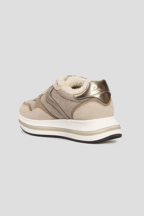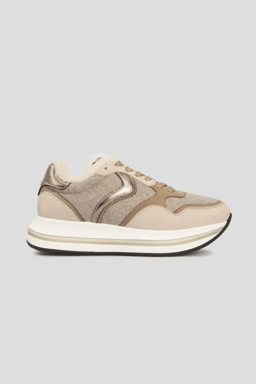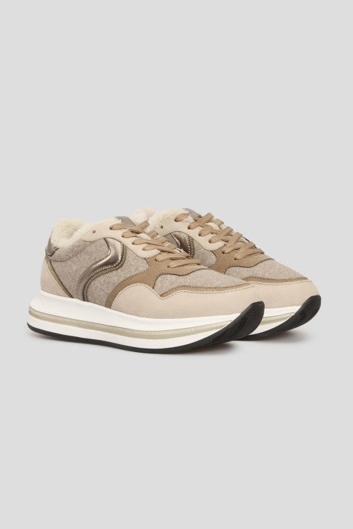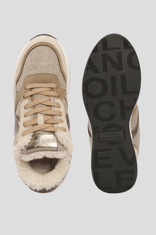 Детали: Женские бежевые кроссовки из кожи и текстиля на меху от Voile Blanche (Вуаль Бланш). Комбинация цветов и материалов, логотип на язычке, классическая шнуровка, закругленный носок, внутри на меху. Высота подошвы: 4,5 см