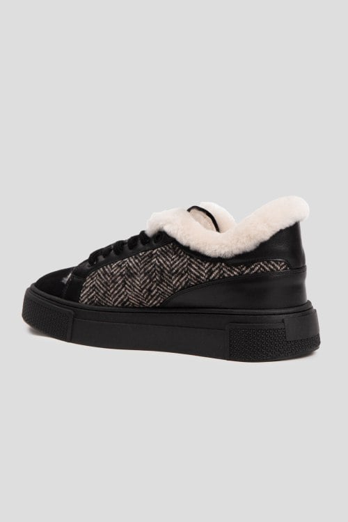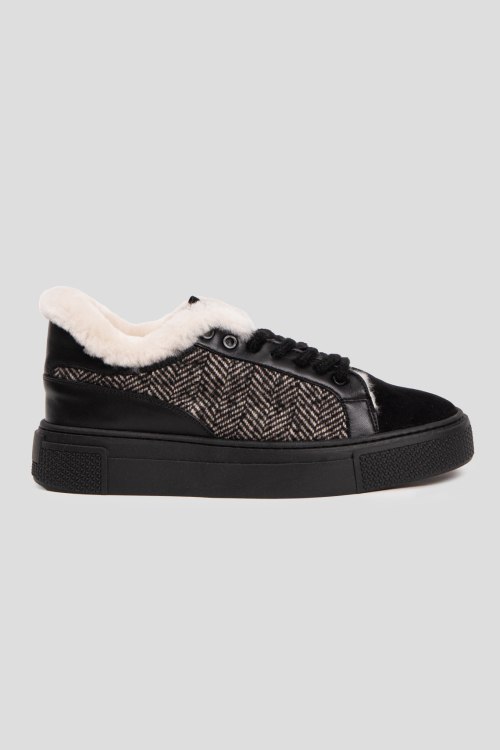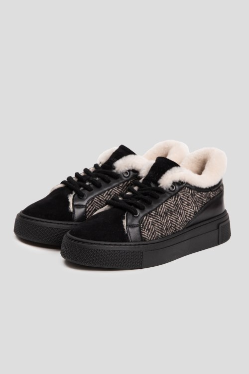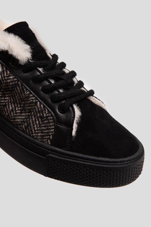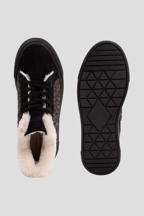 Детали: Женские черные кеды на меху из замши и текстиля от Helena Soretti (Хелена Соретти). Комбинация материалов, логотип на язычке, классическая шнуровка, закругленный носок, внутри на меху. Подошва: 4 см