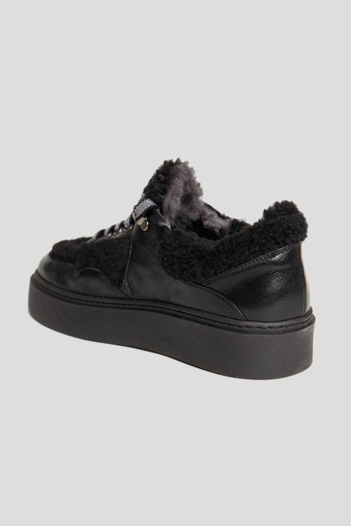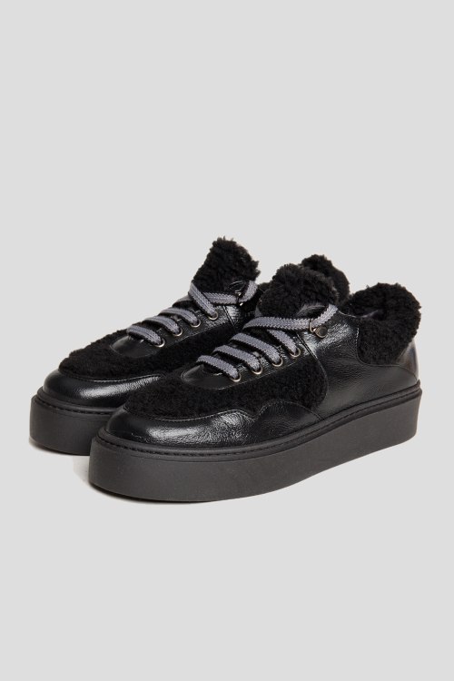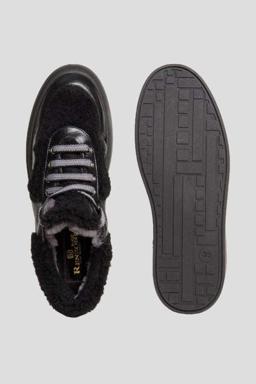 Женские черные кеды из натуральной кожи от Ilasio Renzoni (Иласио Рензони). Закругленный носок, классическая шнуровка, высокая подошва, модель утепленная натуральным мехом