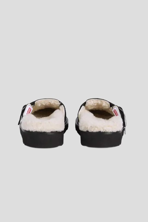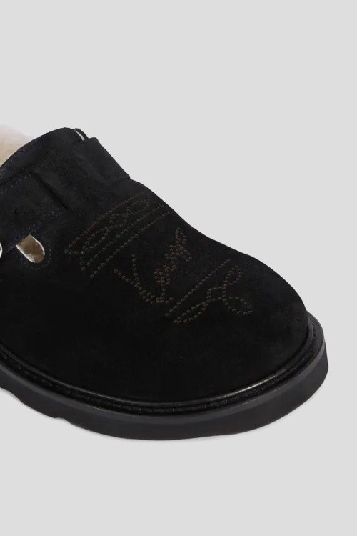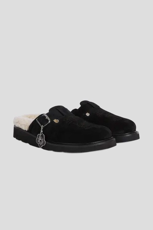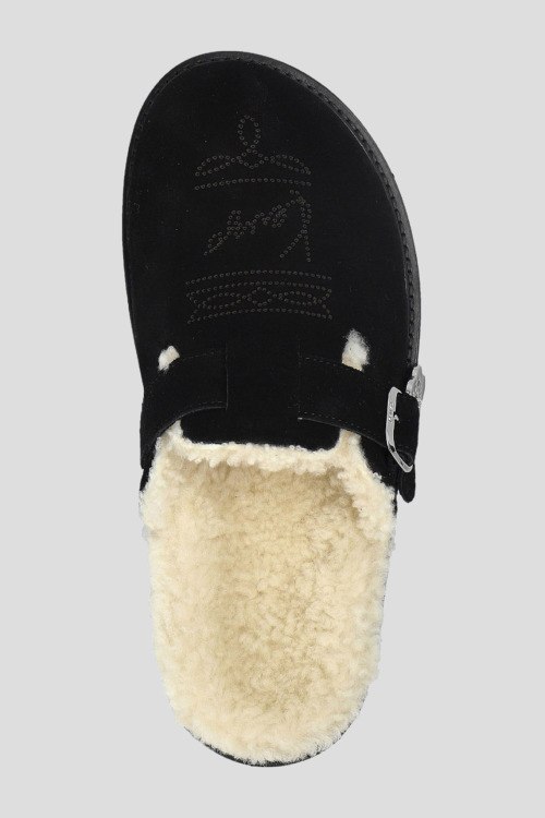 Женские черные замшевые мюли на меху Matto от Kenzo (Кензо). Модель с открытой пяткой, подвеска с логотипом, серебристая фурнитура, закругленный носок, внутри на меху