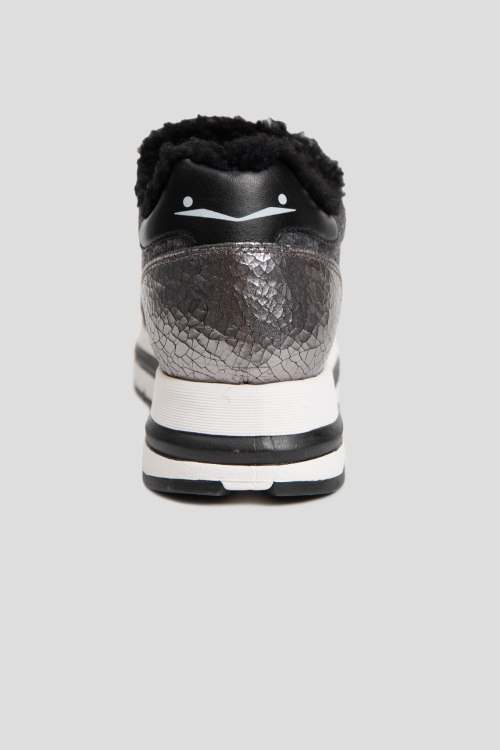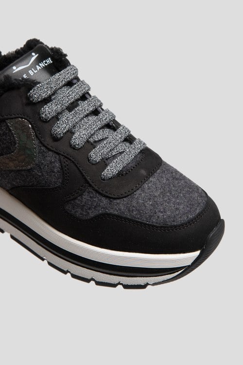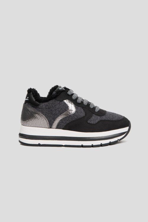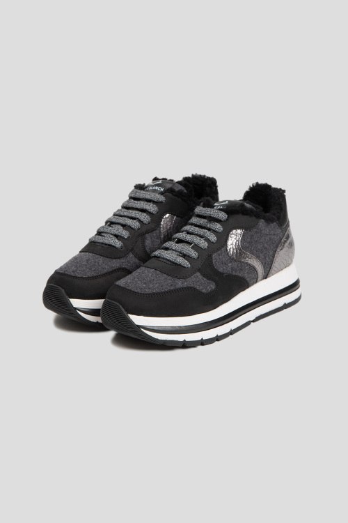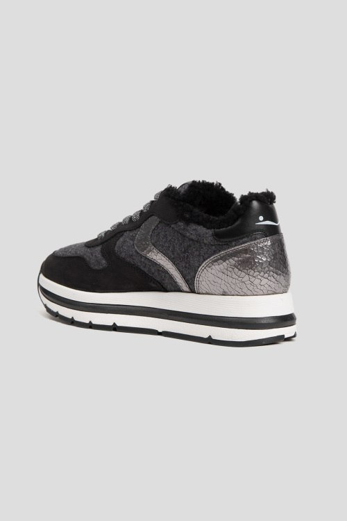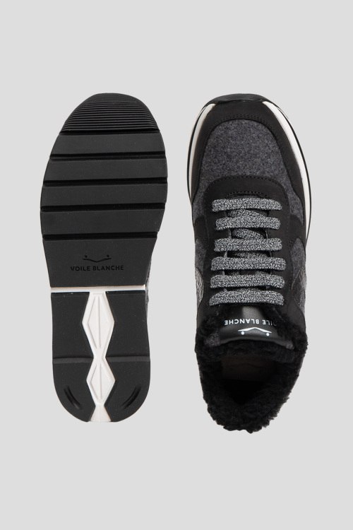 Детали: Женские черно-серые кроссовки на меху из нубука и войлока от Voile Blanche (Вуаль Бланш). Комбинация цветов и материалов, меховая отделка, логотип на язычке, классическая шнуровка, закругленный носок, внутри на меху