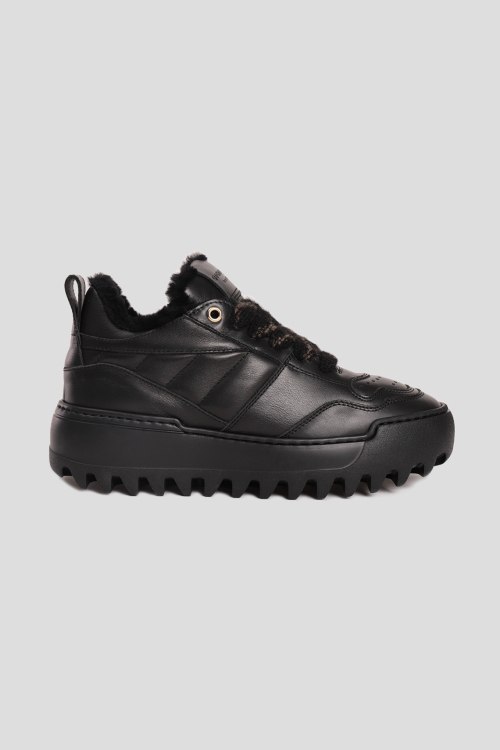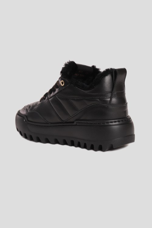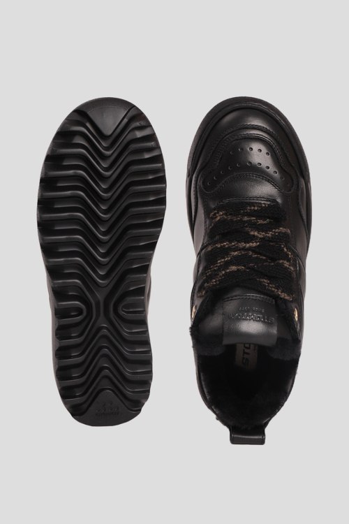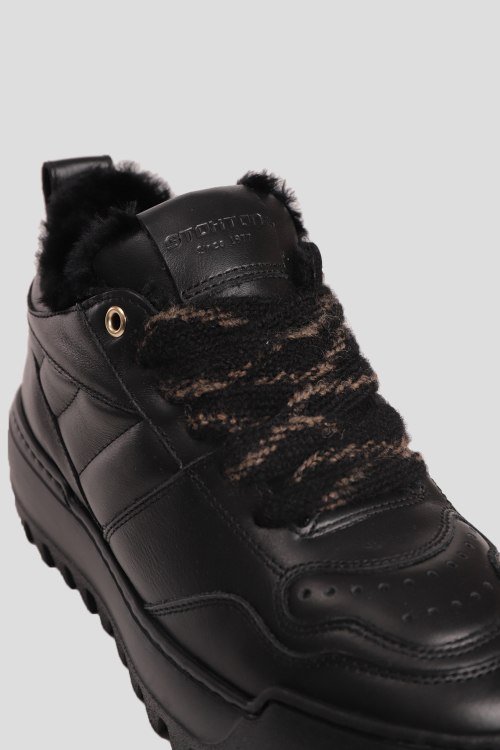 Детали: Женские черные кожаные кроссовки на меху от Stokton (Стоктон). Модель из гладкой кожи, нашивка с логотипом на язычке, петля для подтягивания сзади, классическая шнуровка, закругленный носок