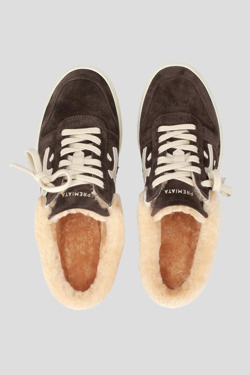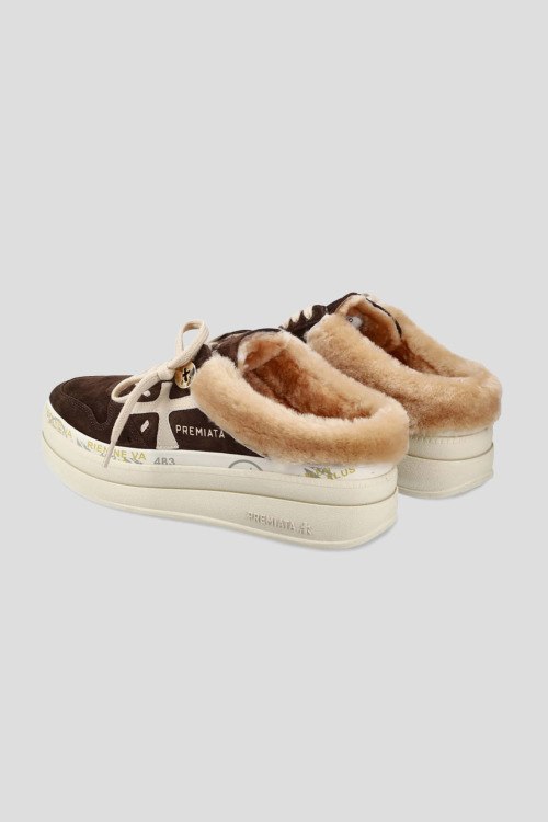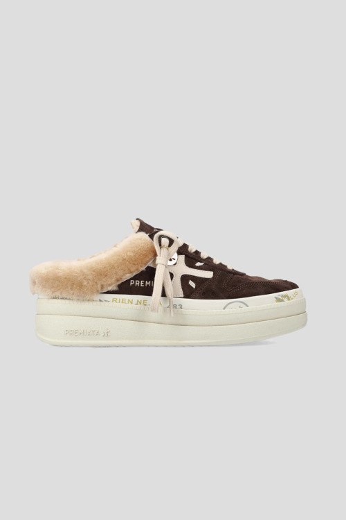 Детали: Женские темно-коричневые замшевые кеды на меху Micol от Premiata (Премиата). Модель с открытой пяткой, логотип сбоку и на язычке, классическая шнуровка, закругленный носок, высокая подошва, внутри на меху