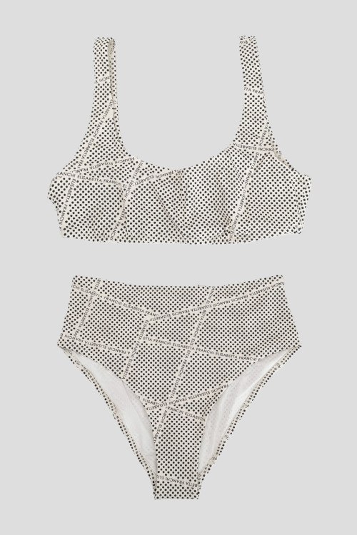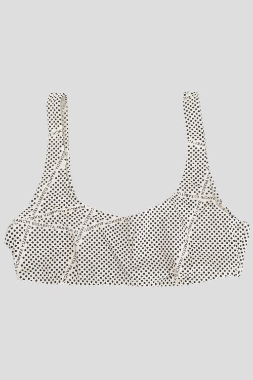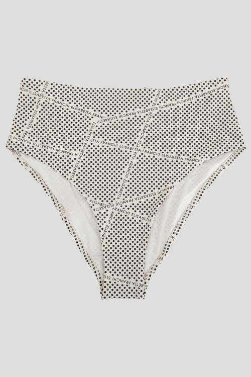Детали: Женский раздельный купальник молочного оттенка от Elisabetta Franchi (Елизабетта Франчи). Принт с логотипом, принт в мелкий горошек, бюстгальтер без чашек, трусики с высокой посадкой