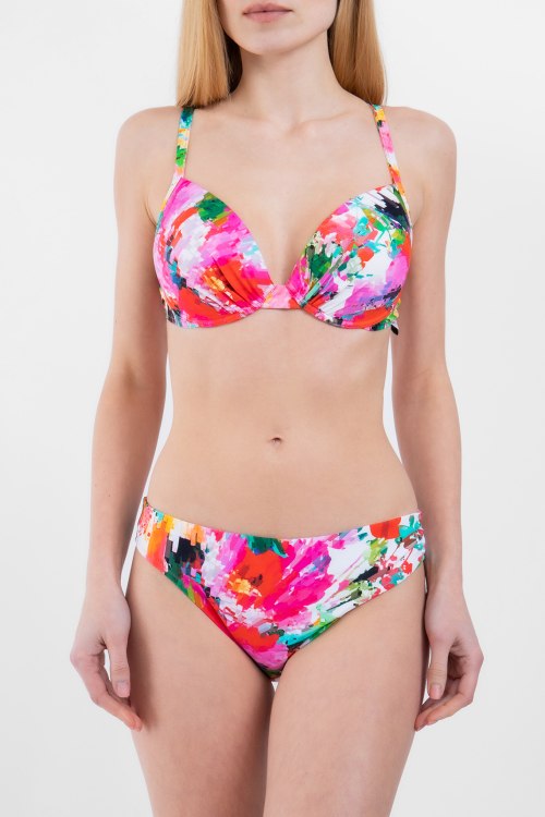 Женский розовый раздельный купальник от Roidal (Ройдал). Купальный лиф с застежкой на спине, регулируемые бретели, структурная чашка с драпировкой, трусики слипы, яркий принт.