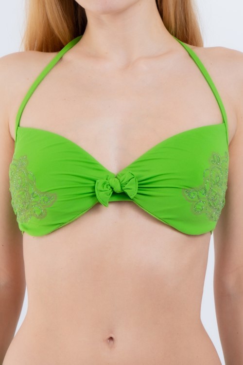 Женский зеленый раздельный купальник от Parah (Пара). Формованная чашка, завязки на шее, на спине застежка, спереди драпировка с завязкой, плавки слипы, верх и низ с декором в виде узора с блестками.