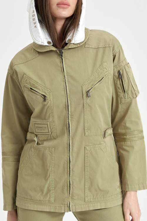Детали: Женская хлопковая куртка песочного цвета от Aeronautica Militare (Аэронавтика Милитари). Контрастный съемный капюшон, четрые передних кармана, один карман на рукаве, отложной воротник, застежка-молния, классическая длина