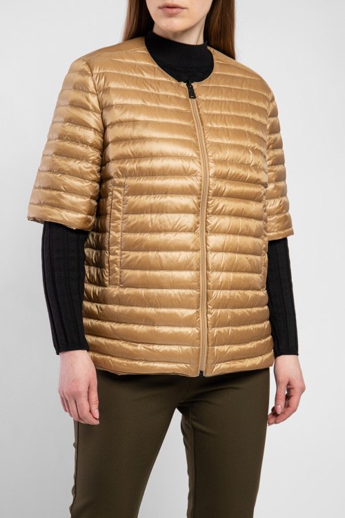 Женская бежевая куртка из нейлона от Bosideng (Босиден). Двухсторонняя модель, круглый вырез горловины, застежка на молнию, стеганый дизайн, короткие рукава, боковые карманы на молнии, патч-лого на рукаве, модель утепленная миксом из пуха и пера. После специальной обработки изделия остаются «дышащими», непромокаемыми и эластичными. Они не деформируются после стирки, пух не «оплывает» и не вылезает из швов. И по весу они очень легкие.