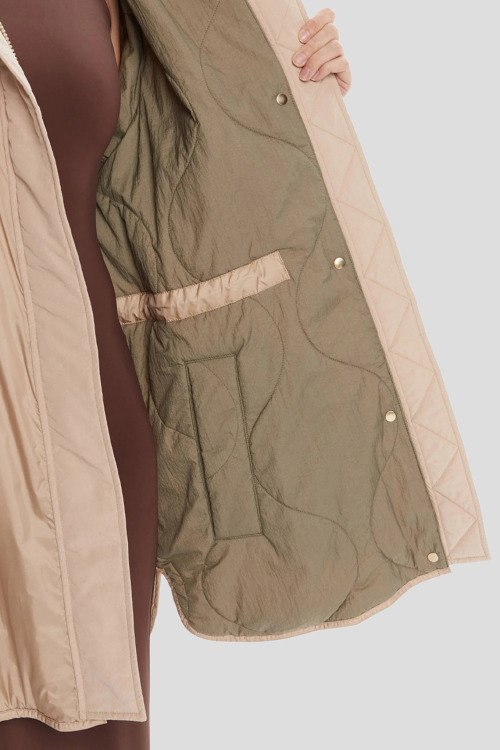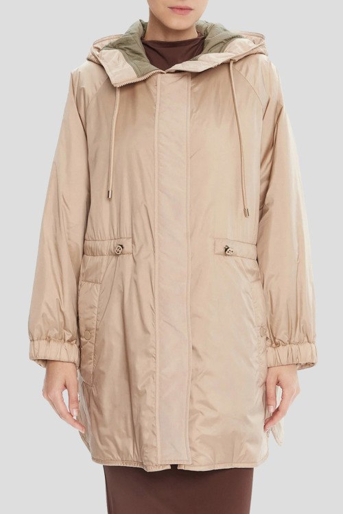 Детали: Женская двухсторонняя куртка Alcamo от Max Mara Weekend (Макс Мара Викенд). Оливковый и бежевый цвет, вшитый капюшон, боковые карманы, застежка на молнию и кнопки, манжеты на резинке, легкое утепление, удлиненная длина