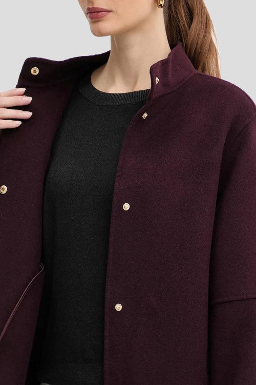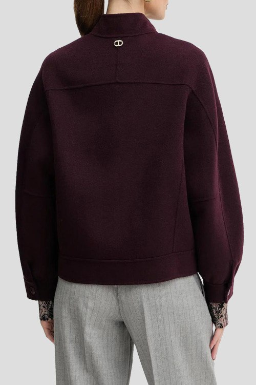 Детали: Женская бордовая куртка из шерстяного микса от TWINSET (Твинсет). Воротник-стойка, нашивка с логотипом сзади, боковые карманы, застежка на брендированные кнопки, классическая длина