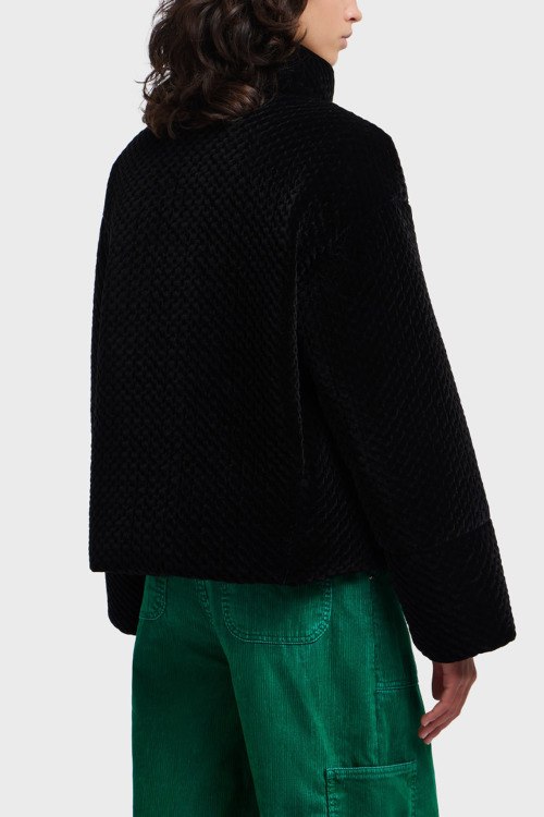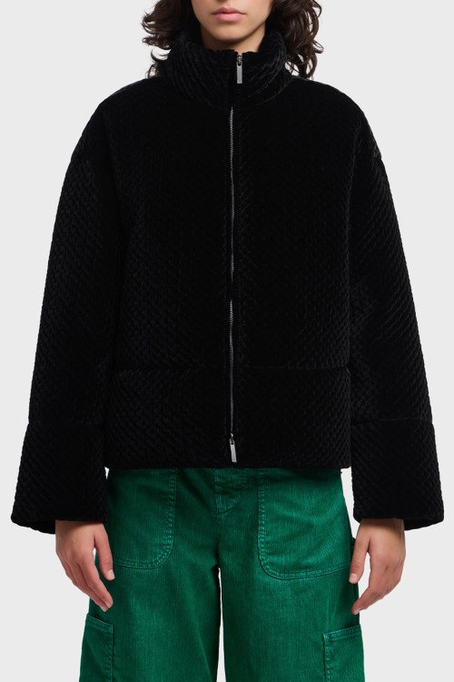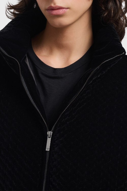 Детали: Женская черная вельветовая куртка от Emporio Armani (Эмпорио Армани). Высокий воротник-стойка, застежка на молнию
