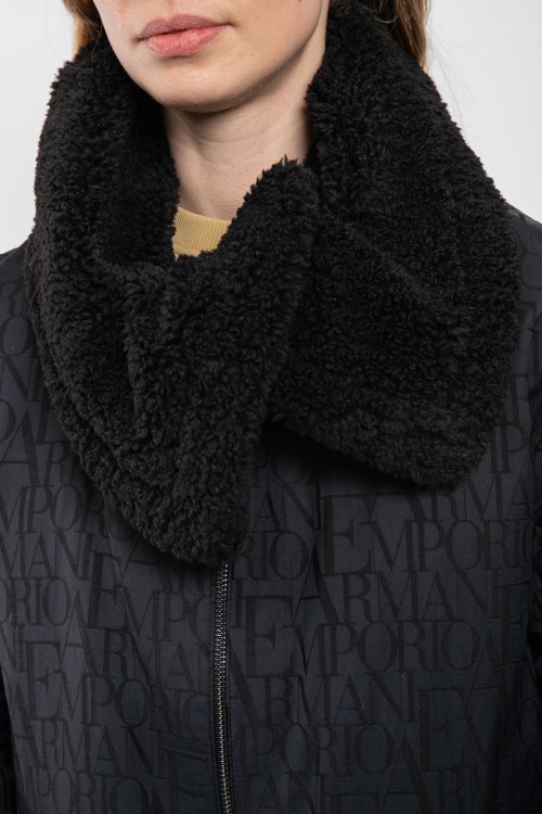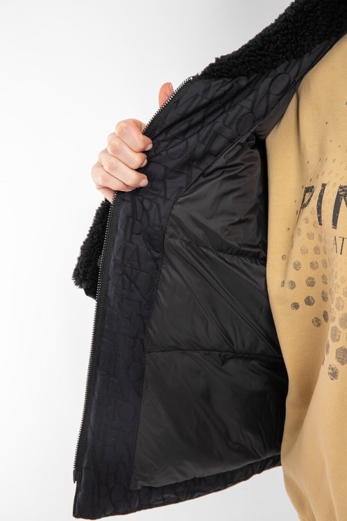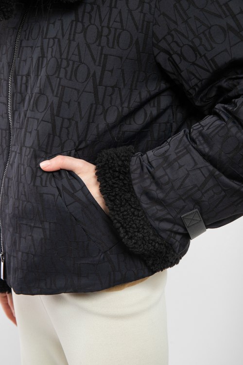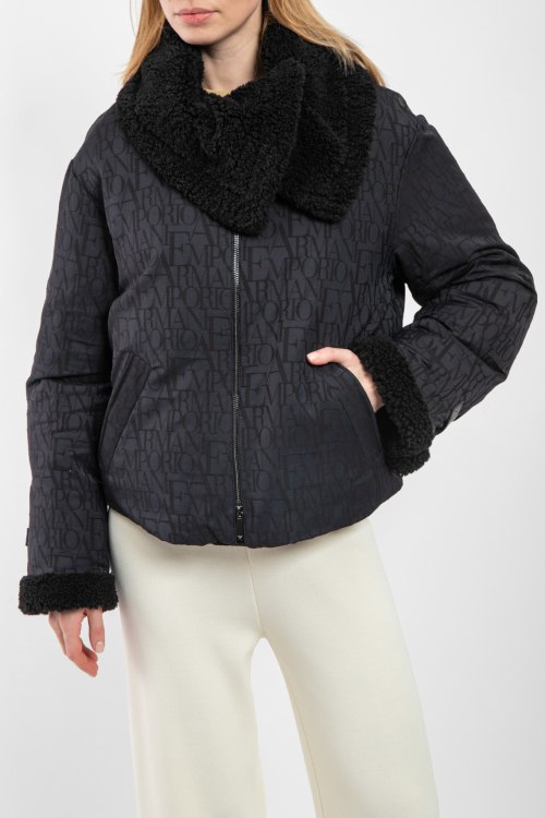 Женская черная куртка из полиэстера от Armani (Армани). Застежка на молнию, объемный меховой воротник, дизайн с монограммой по всей поверхности изделия, прорезные карманы, манжеты с меховым отворотом, модель утепленная синтепоном