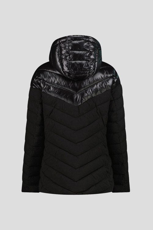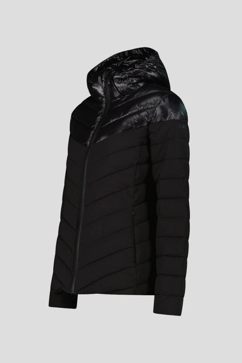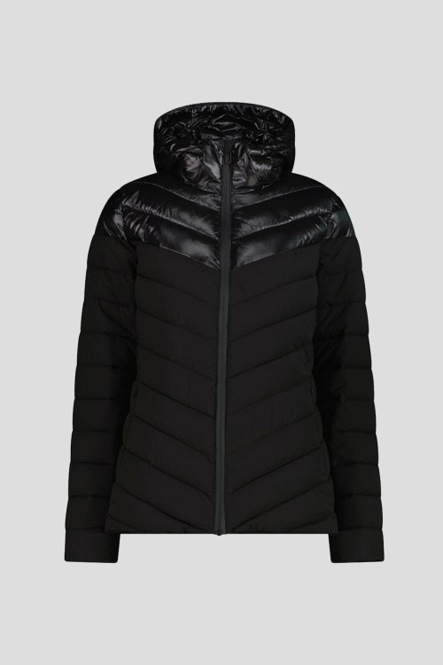 Детали: Женская черная куртка Snaps Hood Sorona Aura из полиэстера от CMP (СМП). Стеганый дизайн, комбинация материалов, воротник-стойка, вшитый капюшон, прорезные карманы, утепленная синтепоном