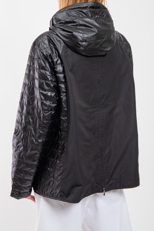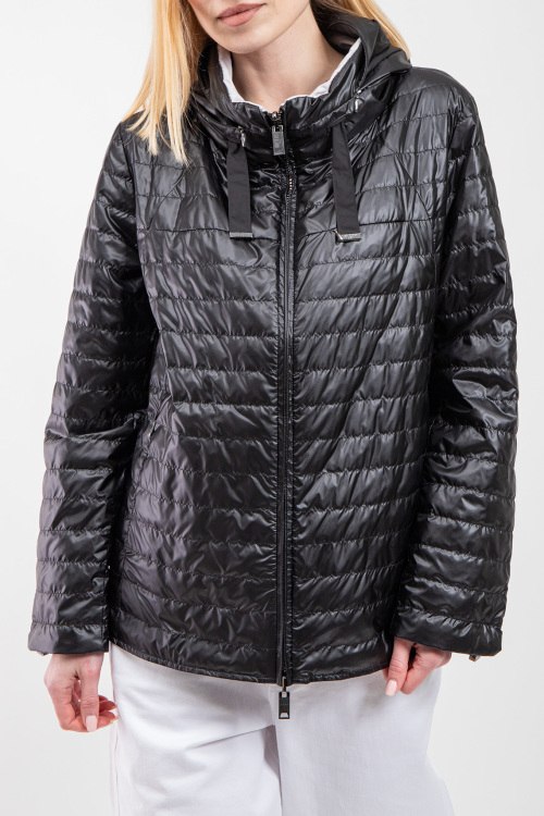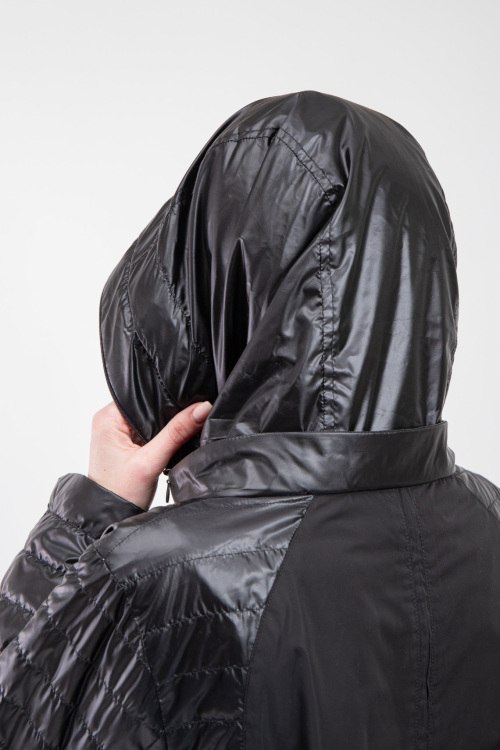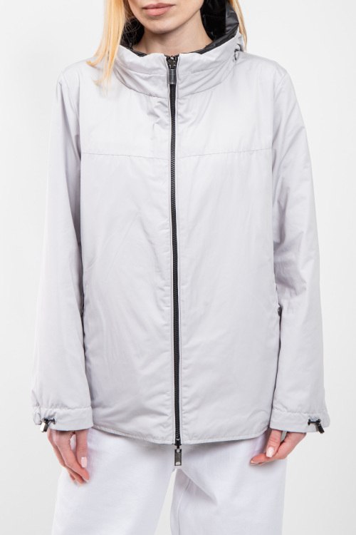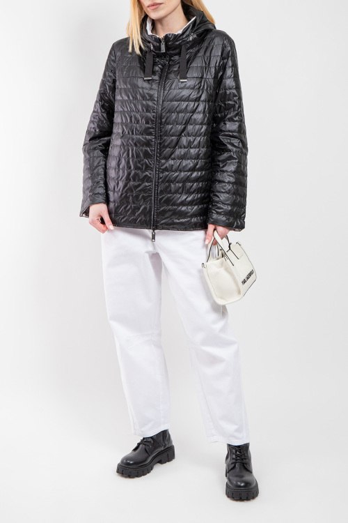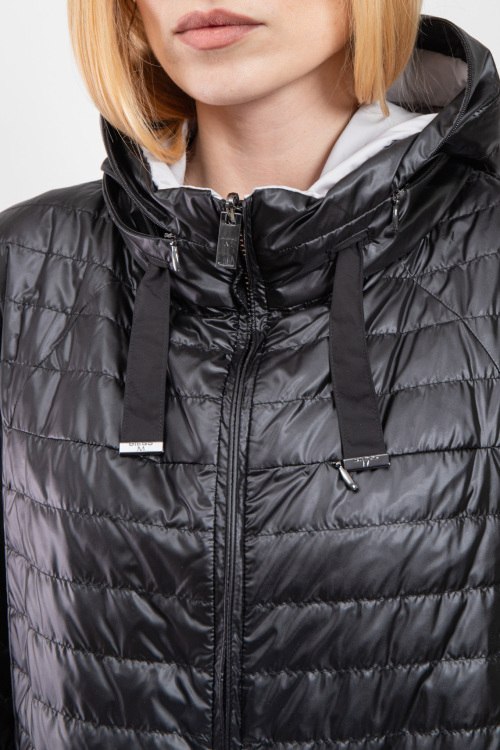 Женская куртка из полиэстера от Diego M (Диего М). Стеганый двухсторонний дизайн, одна сторона черного цвета, другая светло-серого, высокий воротник-стойка, застежка на молнию, прорезные карманы, вшитый потайной капюшон, модель утепленная миксом из пуха и пера. Замеры для размера 48: длина: 65 см, ширина по груди: 59 см, ширина по талии: 60,5 см, длина рукава по внутреннему шву: 45 см, ширина рукава: 20 см.