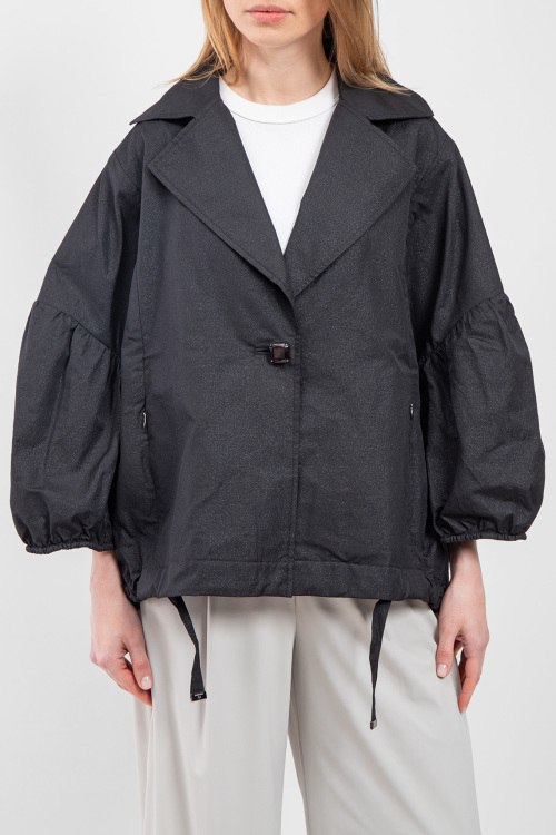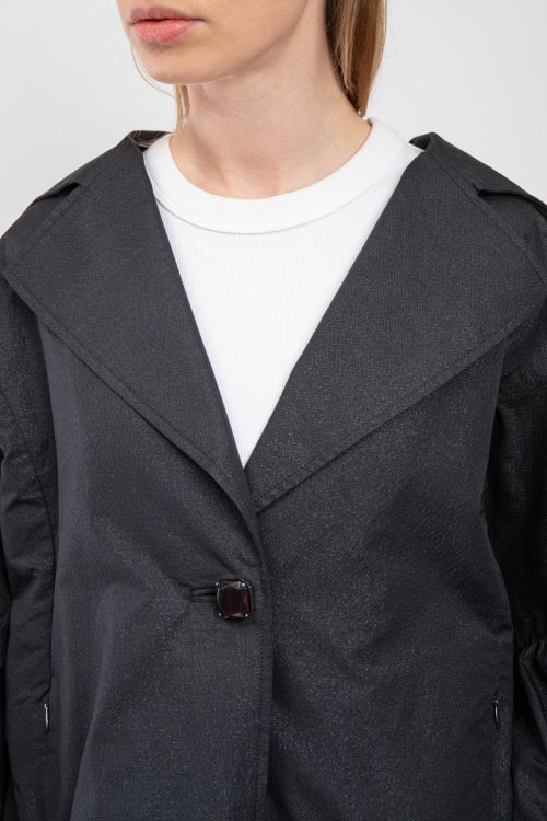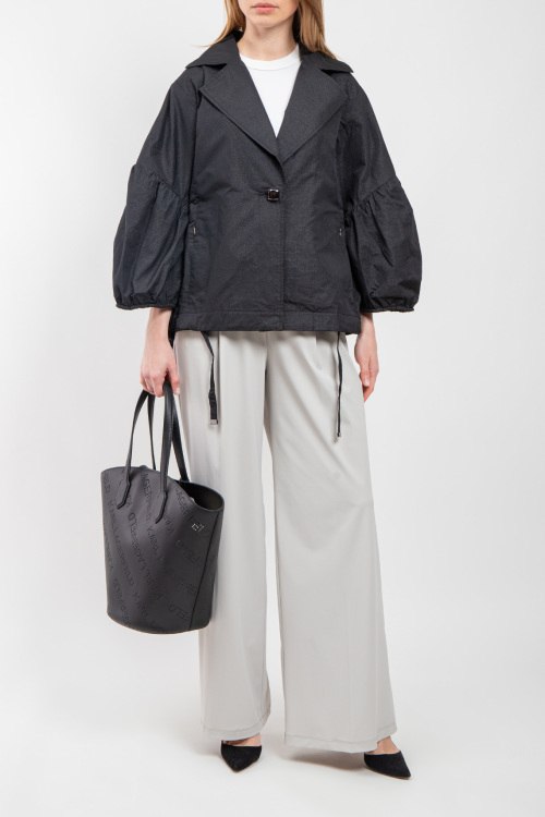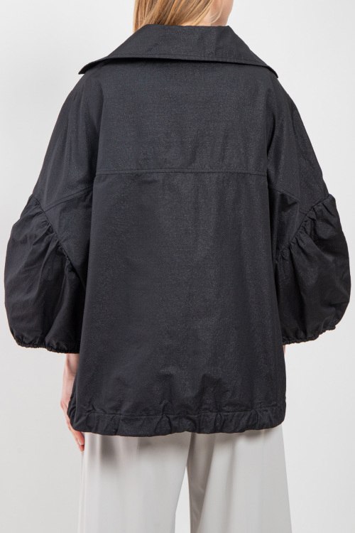 Детали: Женская черная куртка из полиэстера и вискозы от Diego M (Диего М). Отложной воротник, застежка на пуговицы, модель широкого кроя, объемные рукава 7/8, прорезные карманы на молнии, эластичная резинка по низу изделия, декоративная люрексовой нитью