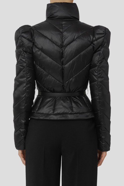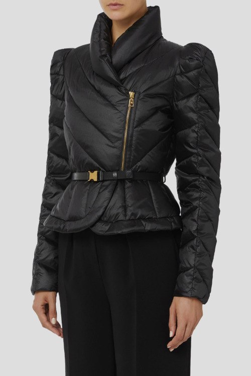 Детали: Женская черная утепленная куртка от Elisabetta Franchi (Елизабетта Франчи). Короткая куртка из парусной ткани с блестящей переливающейся текстурой. Утепленная и стеганая модель с шевронным мотивом оформлена высоким воротником-стойкой с запа́хом и рукавами с приподнятыми плечами и легким эффектом присборки. Небольшая баска, акцентированная ремнем с пряжкой, подчеркивает женственный дизайн изделия