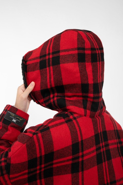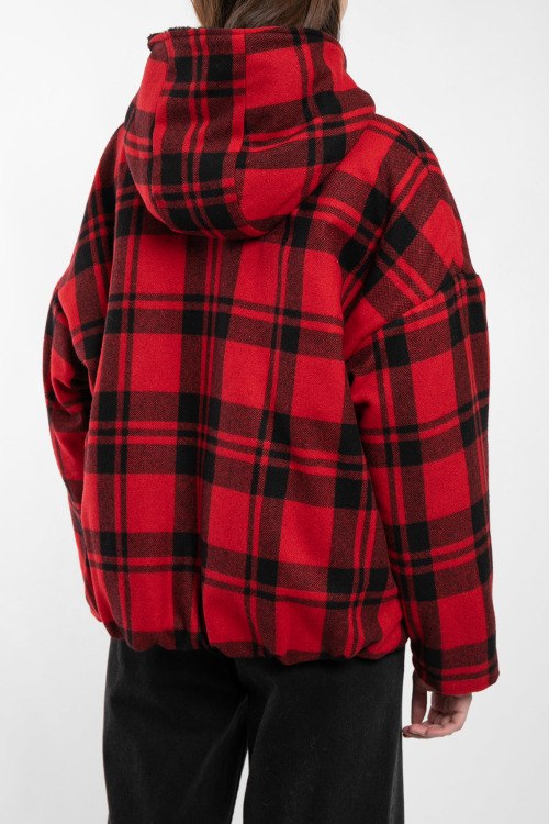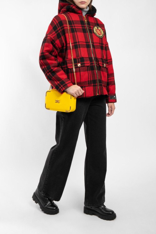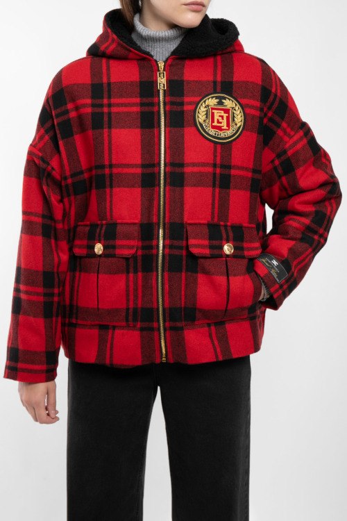 Женская красная куртка из шерстяного микса от Elisabetta Franchi (Елизабетта Франчи). Дизайн в клетку, вшитый капюшон, застежка на молнию, карман с клапаном, нашивка на груди, патч-лого