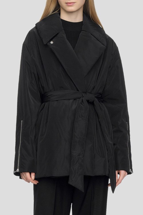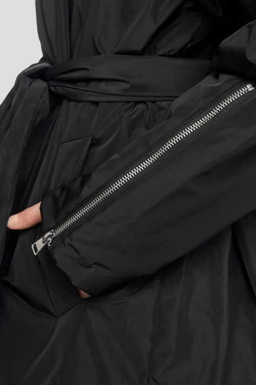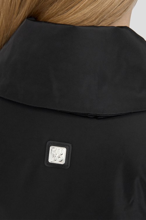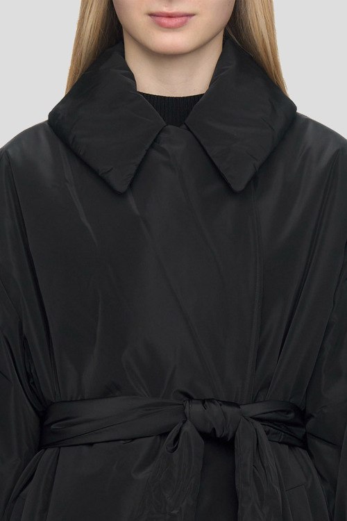 Женская черная куртка Faiana-1 от Hugo Boss (Хуго Босс). Объемный отложной воротник, боковые карманы, в талии с поясом, рукава на молниях, удлиненная длина