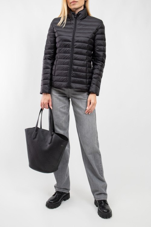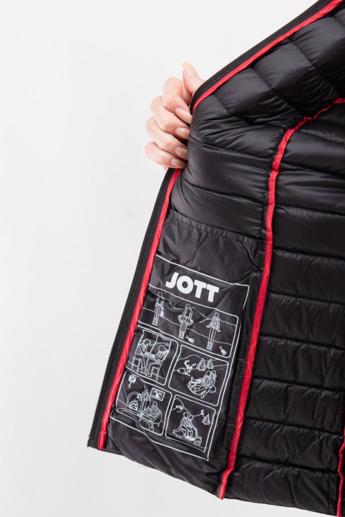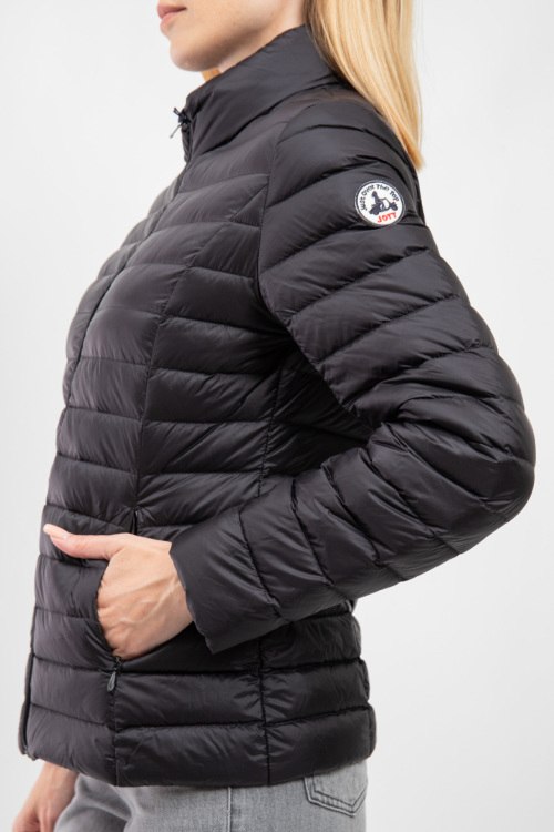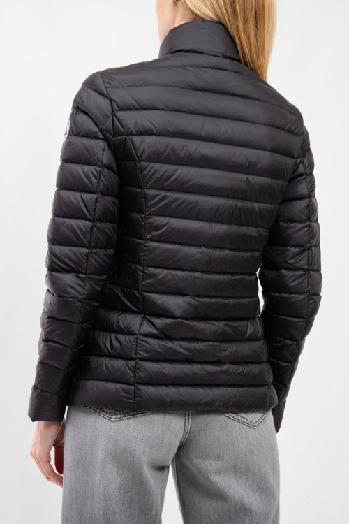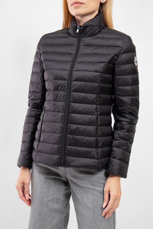 Женская черная куртка на пуху от Jott (Йотт). Стеганый дизайн, высокий воротник, нашивка с логотипом на рукаве, боковые карманы на молнии, застежка-молния, классическая длина, наполнитель из микса пуха и пера.