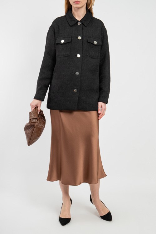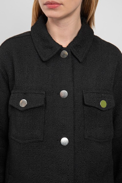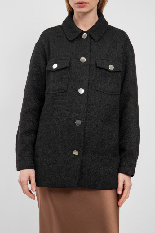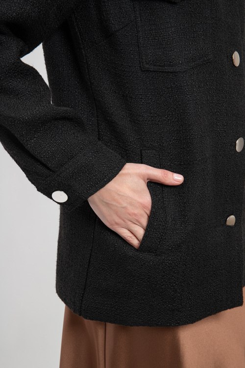 Женская черная куртка из ткани букле от Lascana (Ласкана). Отложной воротник, четыре передних кармана, застежка на пуговицы, удлиненная длина.