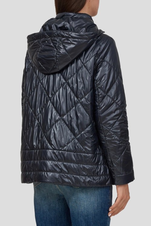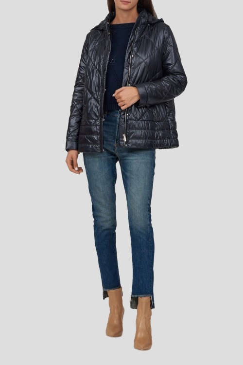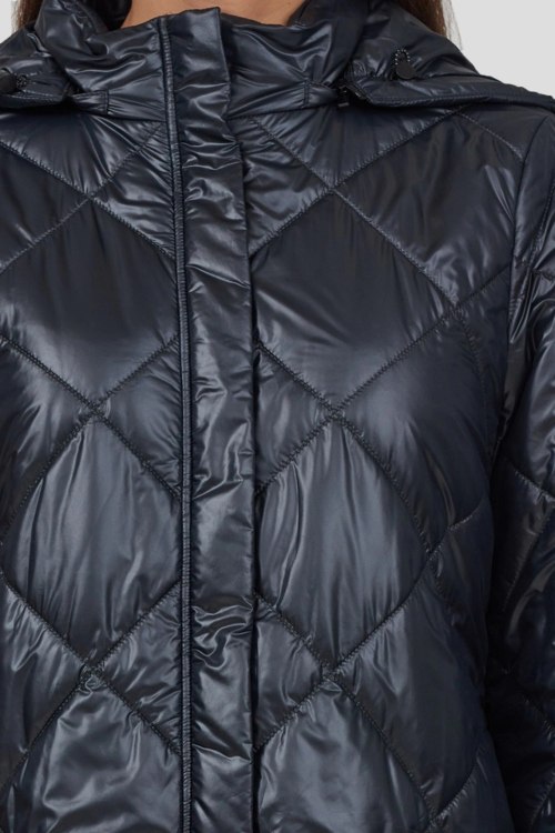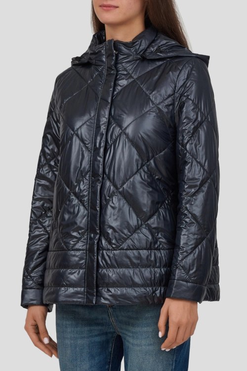 Детали: Женская черная куртка от Marina Rinaldi (Марина Ринальди). Стеганый дизайн, высокий воротник, съемный капюшон, застежка на молнию и кнопки, классическая длина