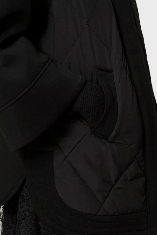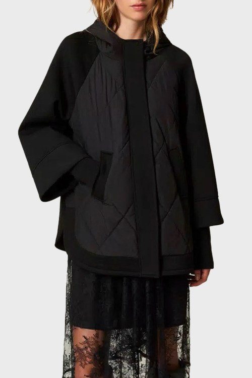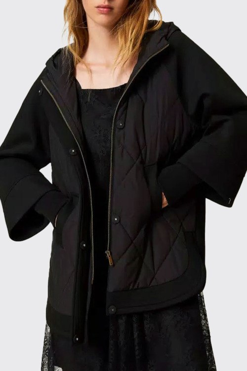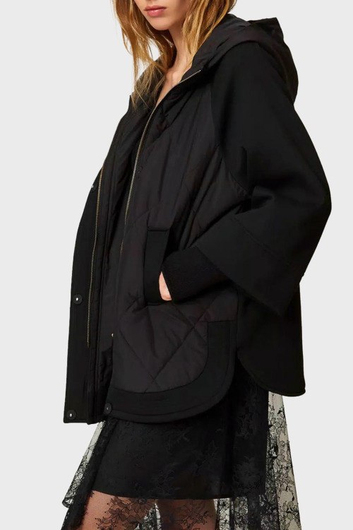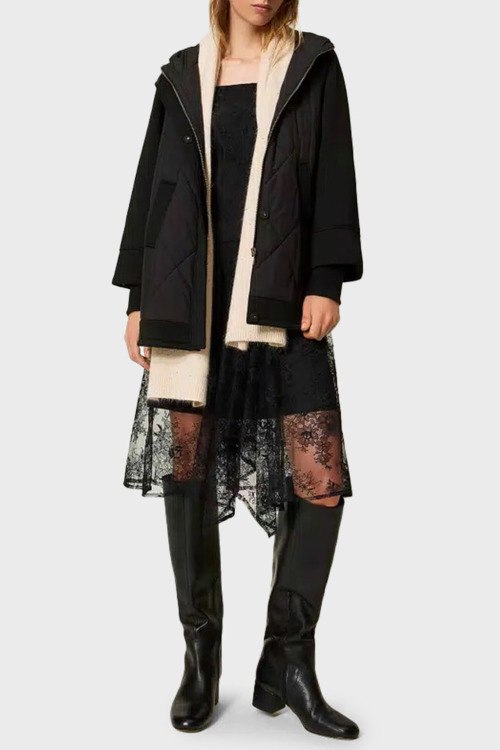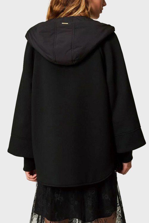 Детали: Женская черная куртка из неопреновой ткани и нейлона от TWINSET (Твинсет). Модель имеет слегка расклешенный силуэт, длинные рукава реглан с широким низом и ветрозащитной манжетой в резинку, металлическую застежку-молнию с клапаном на обтяжных кнопках, прорезные карманы и металлическую пластинку-логотип на капюшоне