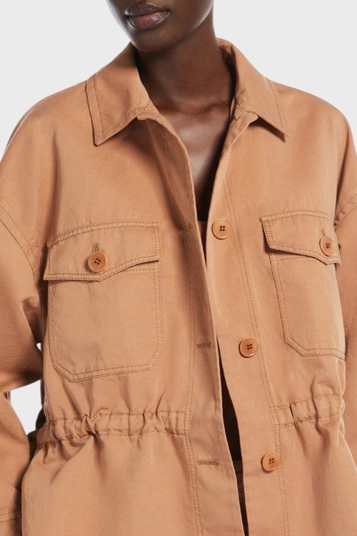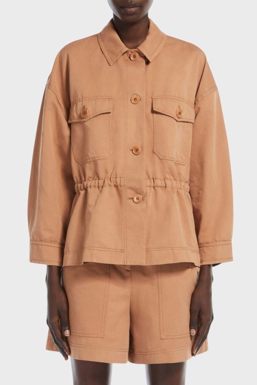 Детали: Женская коричневая куртка из хлопка и льна Eger от Max Mara Weekend (Макс Мара Викенд). Отложной воротник, два кармана на груди, застежка на пуговицы, в талии на затяжке, укороченный рукав, классическая длина